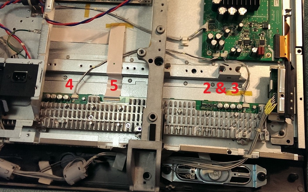 Pictures included: (Looking at the back of the TV, the right side is on the right which is the same as the left side if looking at the TV from the front) Picture 8 is labeled with the connectors that I unplugged. Only one cable was unplugged at a time. Pictures 1-8: