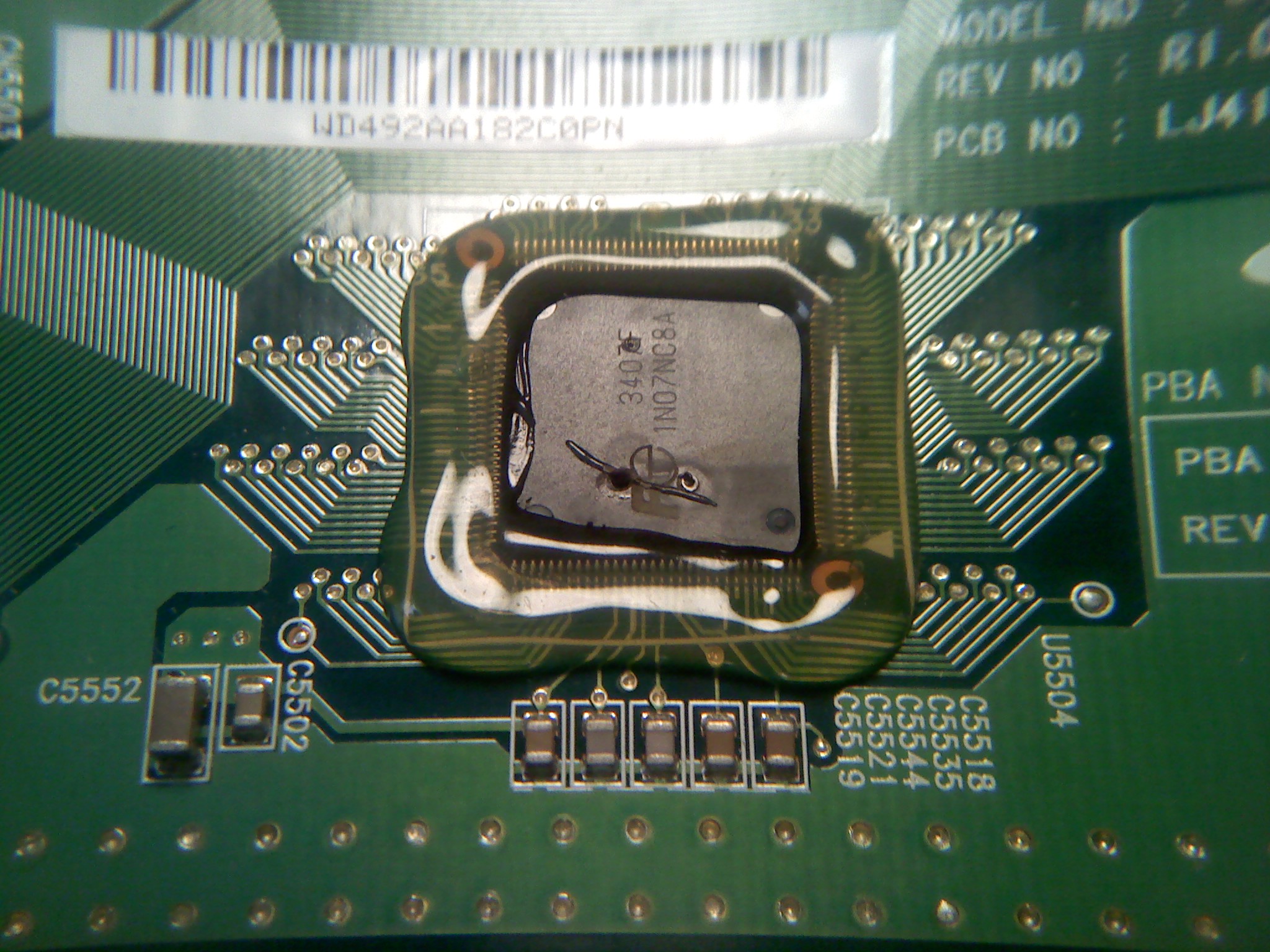 • TV came with vertical bars and no image. Found faulty TVS on left buffer board. Also replaced T-Con (may have damaged the original while hot air removing components, board has slight warp) and have full image but few horizontal lines on the screen. Some of the lines appears to be 2 pixel tall while others are 1 pixel tall.