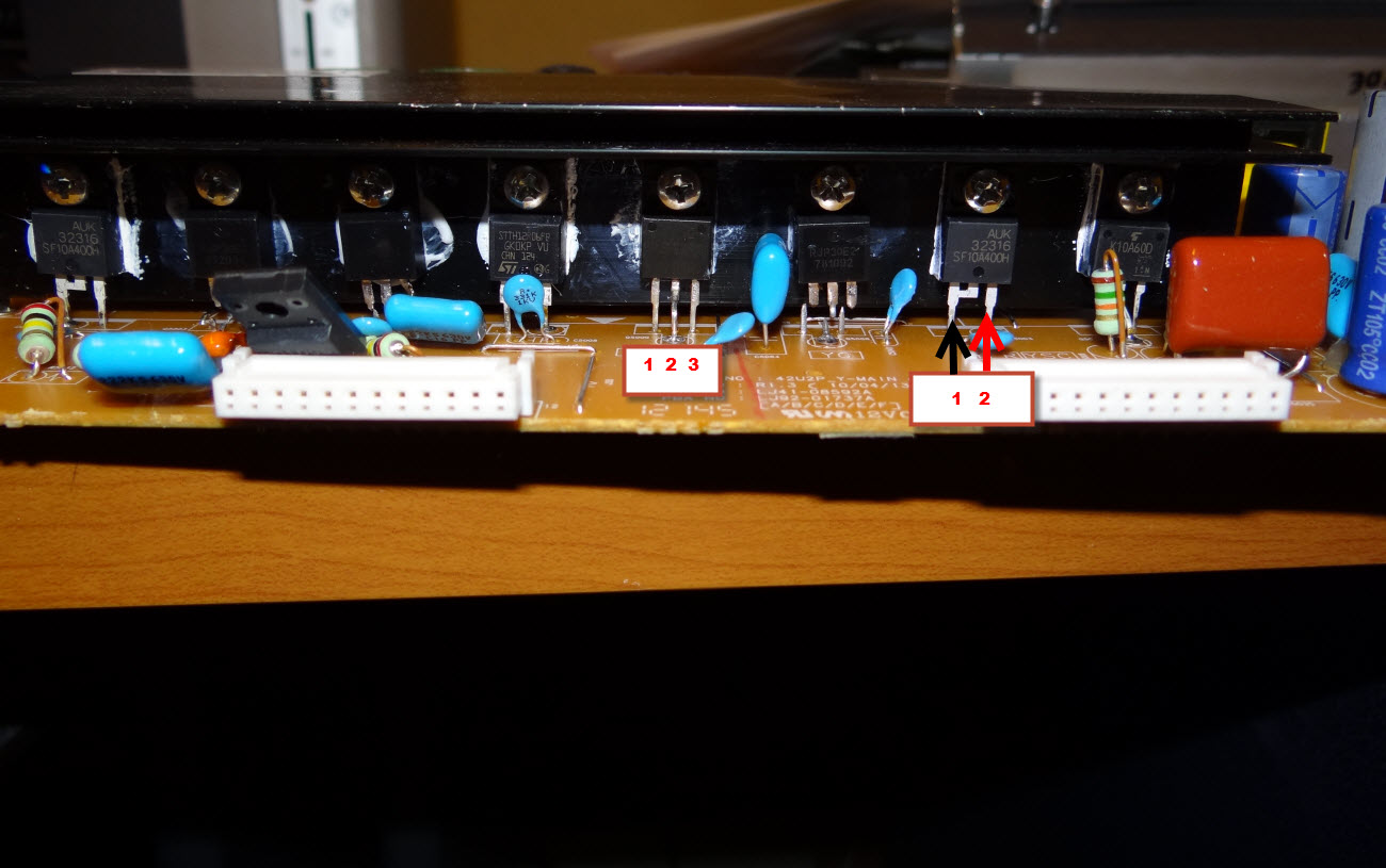 Ok, I've attached a pic of a Y-main from a similar TV. There should be a bunch of three-legged transistors and two-legged diodes on the Y-main's and the X-main's silver-colored large metal heat sinks. In diode mode on a multimeter, do the following: