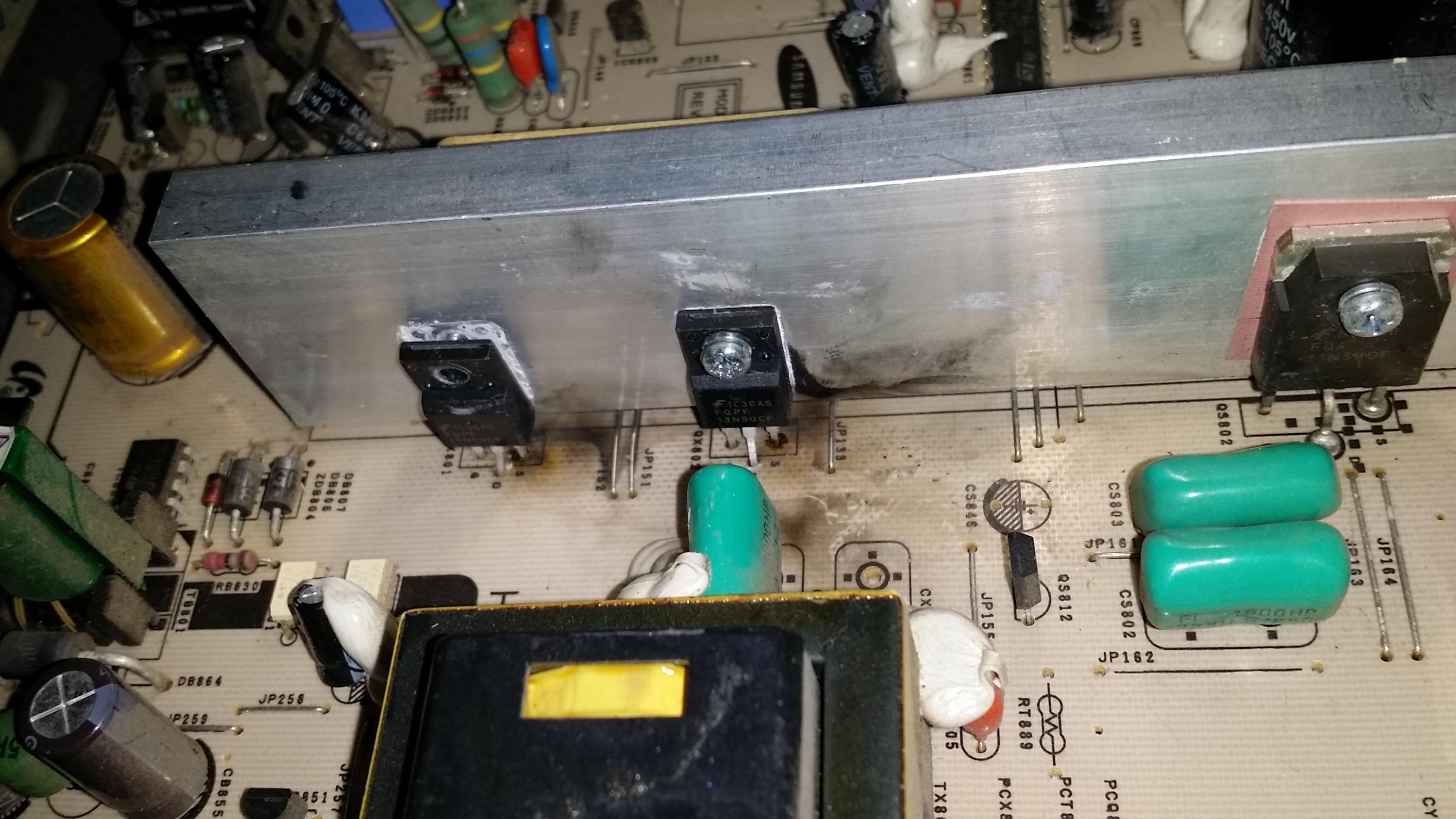 Im not sure what kind of reading I should be getting from the IC36AS that are on the heatsink. It looks like there was previous damage here that has been repaired from the old ICs but I cant be for certain if its these ICs that caused the soot left on the heatsink. I removed one and looked it over and didnt see any visual damage, but I could be wrong. When plugged in it just does the repetitive clicking, I do get 5v on my standby though but nothing else.