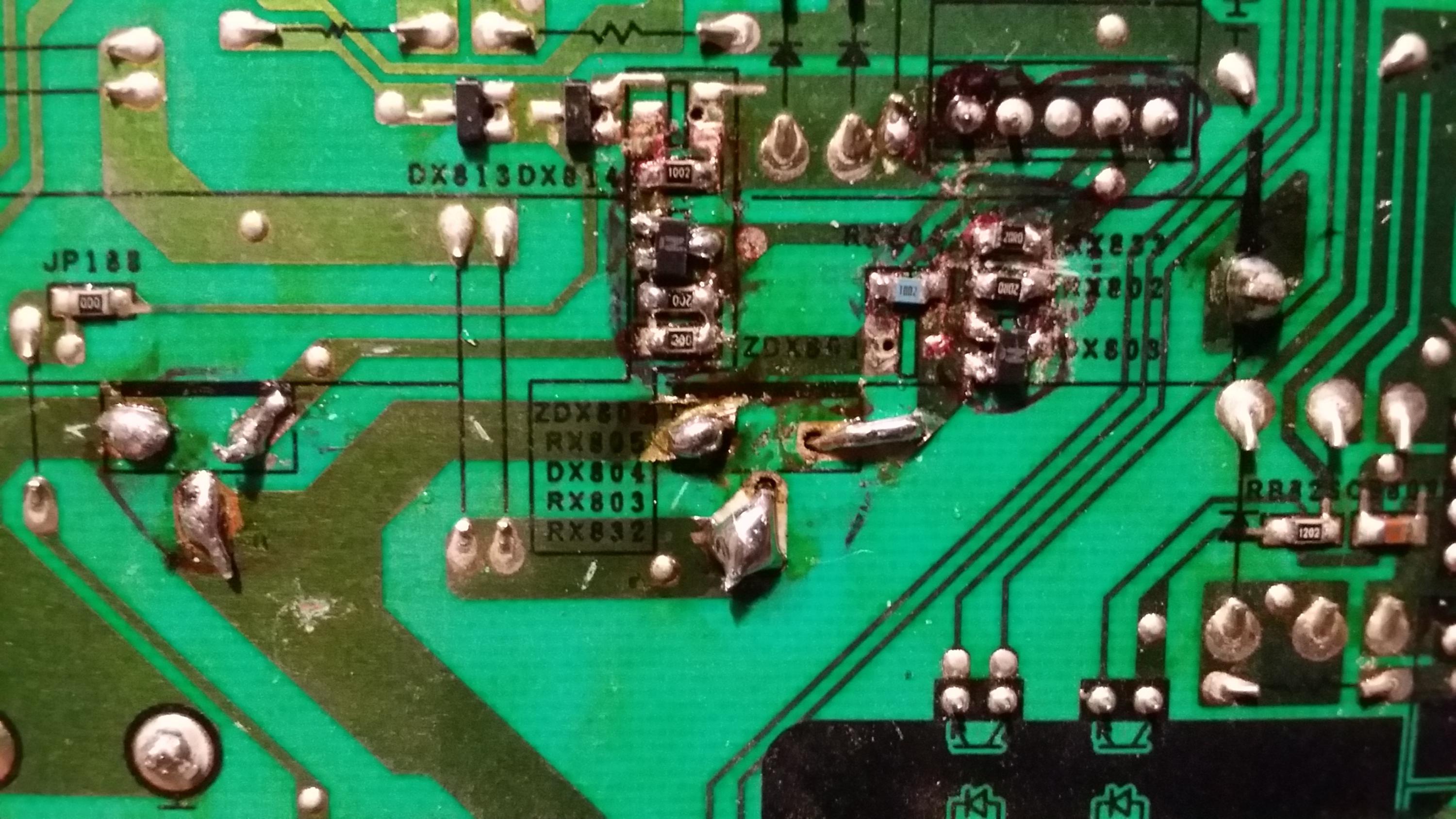I have the same board with the the HPT4254X set. Ive got a problem with constant clicking and the set never fires up. Upon inspection this board was previously repaired. I dont know if the parts are correct from the information I have gathered here, The supposed replaced components which are questionable are shown in the pictures I have attached.