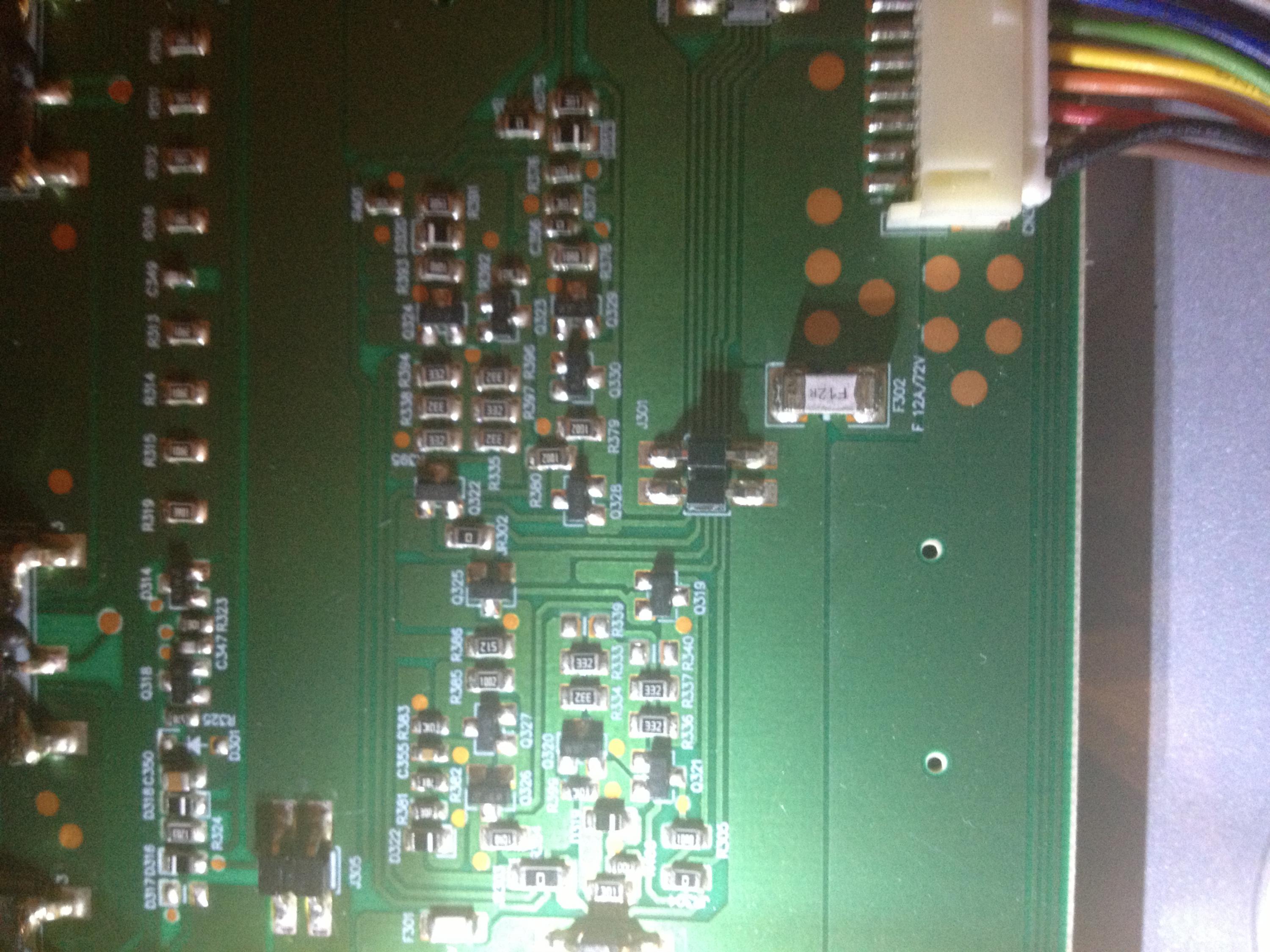 I opened it up and I have a very similar problem to what SCUBE reported above: The Slave 1 and Slave 2 boards are fried at the connector. It's worse than Scuba's, but definitely all around the area of the connector between the two boards. The master boards don't appear do be damaged, and all the capacitors look ok.