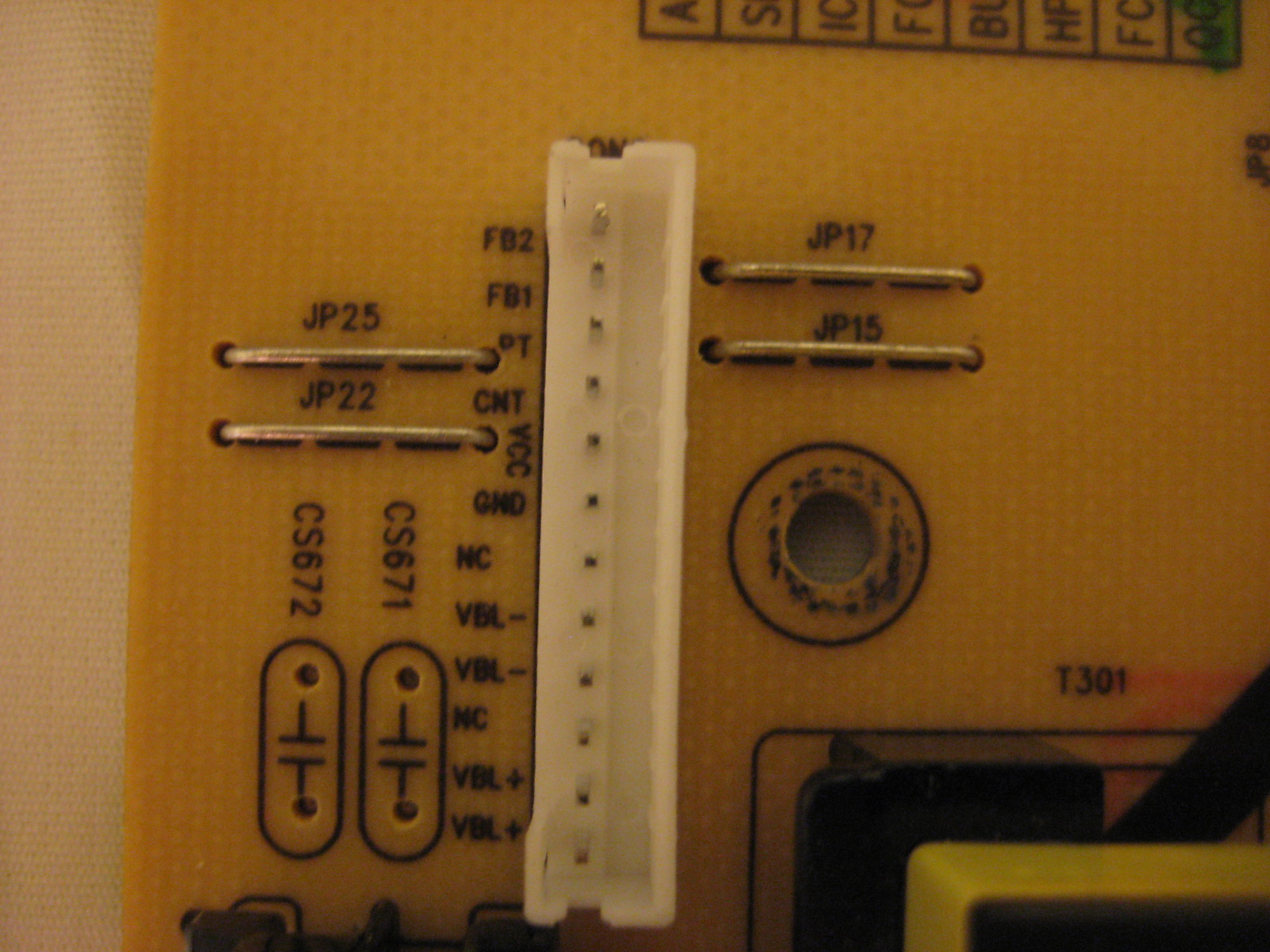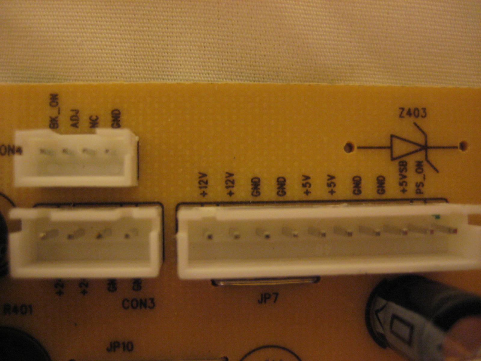 When TV power on, backlight only flash once, then gone. The main unit is good because I can see the picture with flashlight. the backlight pins is at left top corner on the first picture, third picture is detail. TV power on, The backlight pin, only VCC pin is 5V, others is 0. some pins maybe is 0.001. I think 0. There are four pins at right top corner, but only left two pins connect main unit, other two pin is empt. second picture is detail. BK_ON pin is 5V, ADJ pin is 3V when cable connect main unit. If remove cable, both pins are 0. The two pin's power come from main unit, and let backlight on. I understand: The problem is main unit give power supply signal(5V and 3V) to let power supply give power to inverter board, but power supply board is no reaction: only one pin has 5v, others is 0. Someone has idea to help me? Thanks.