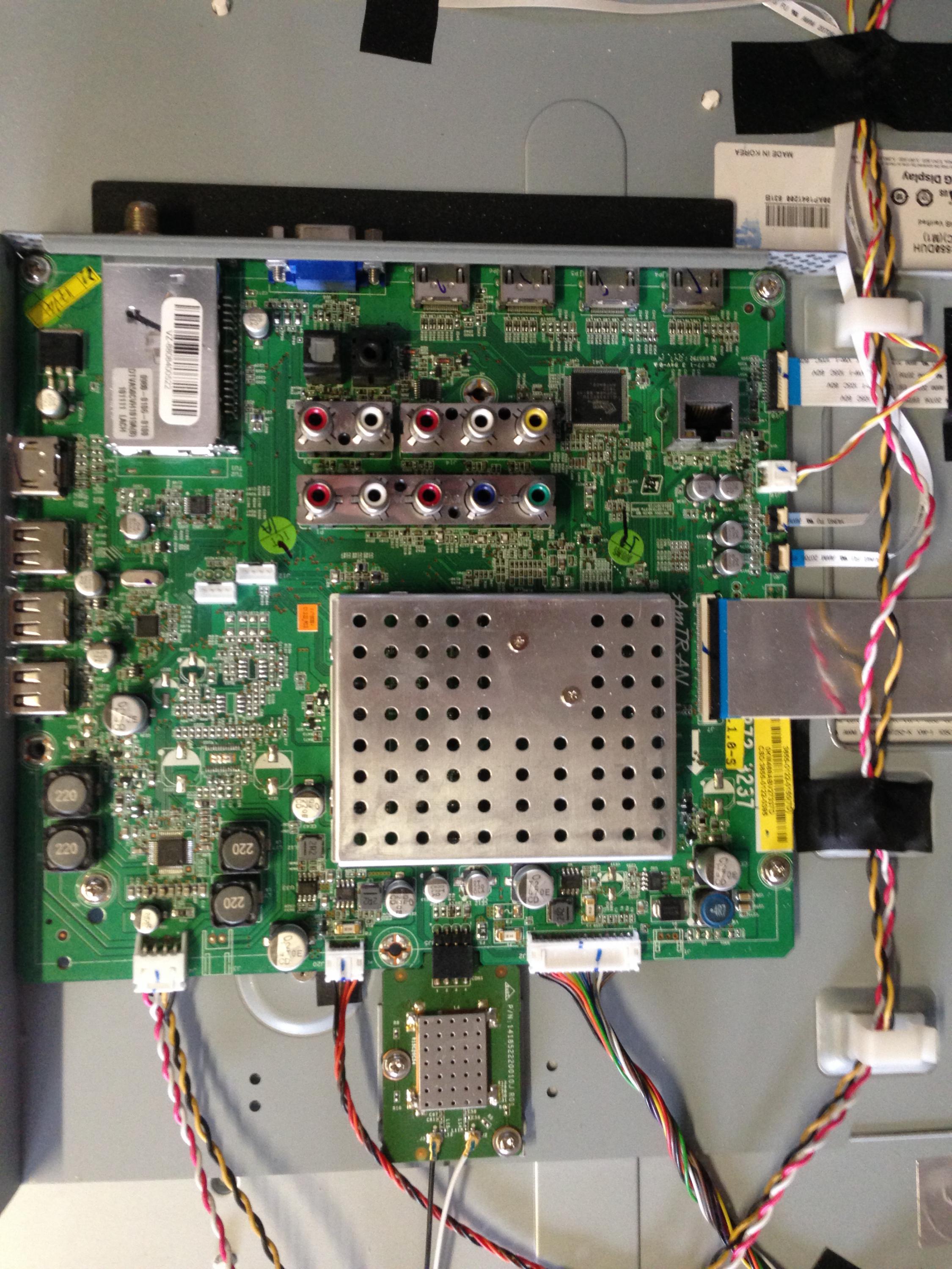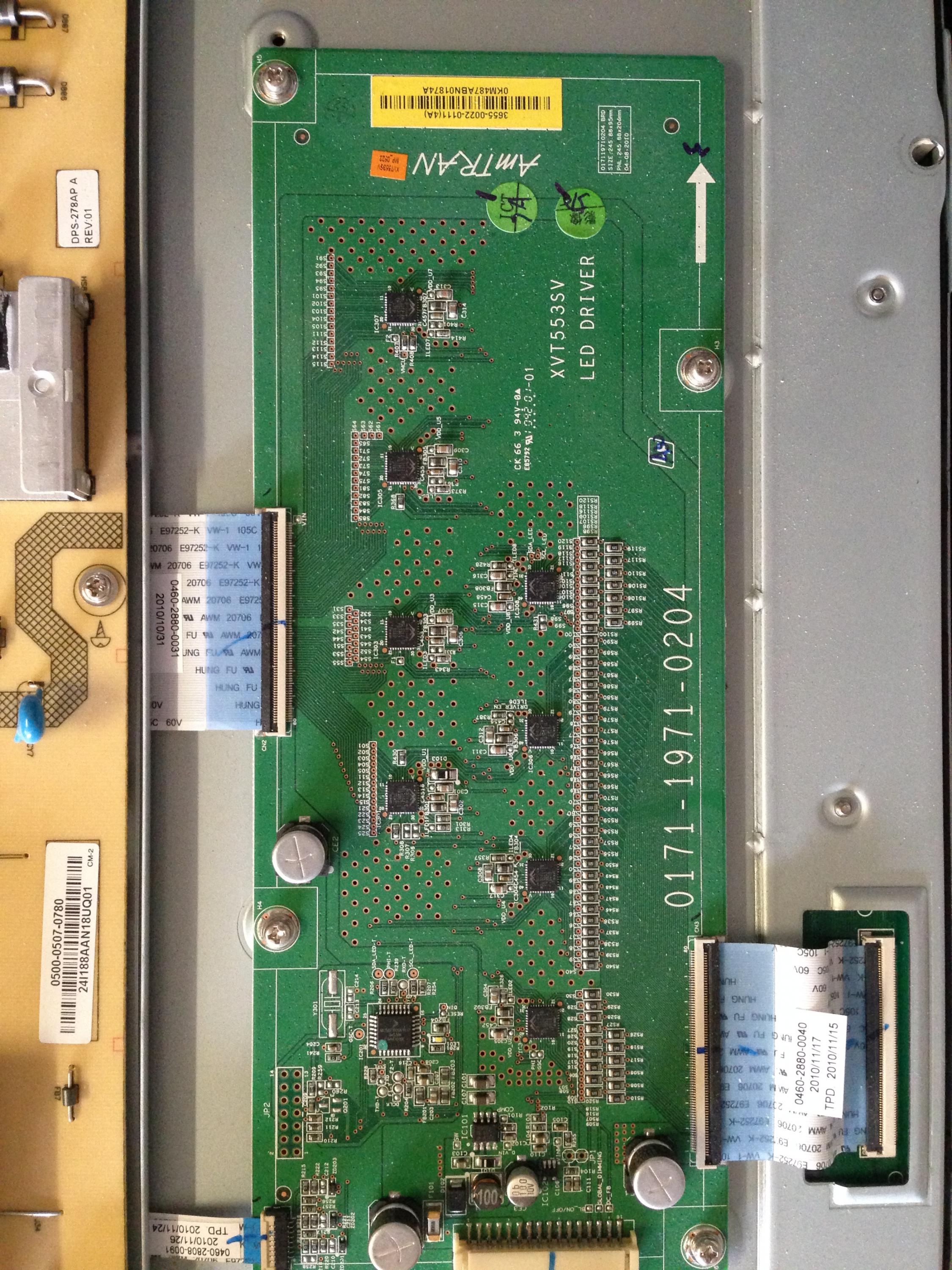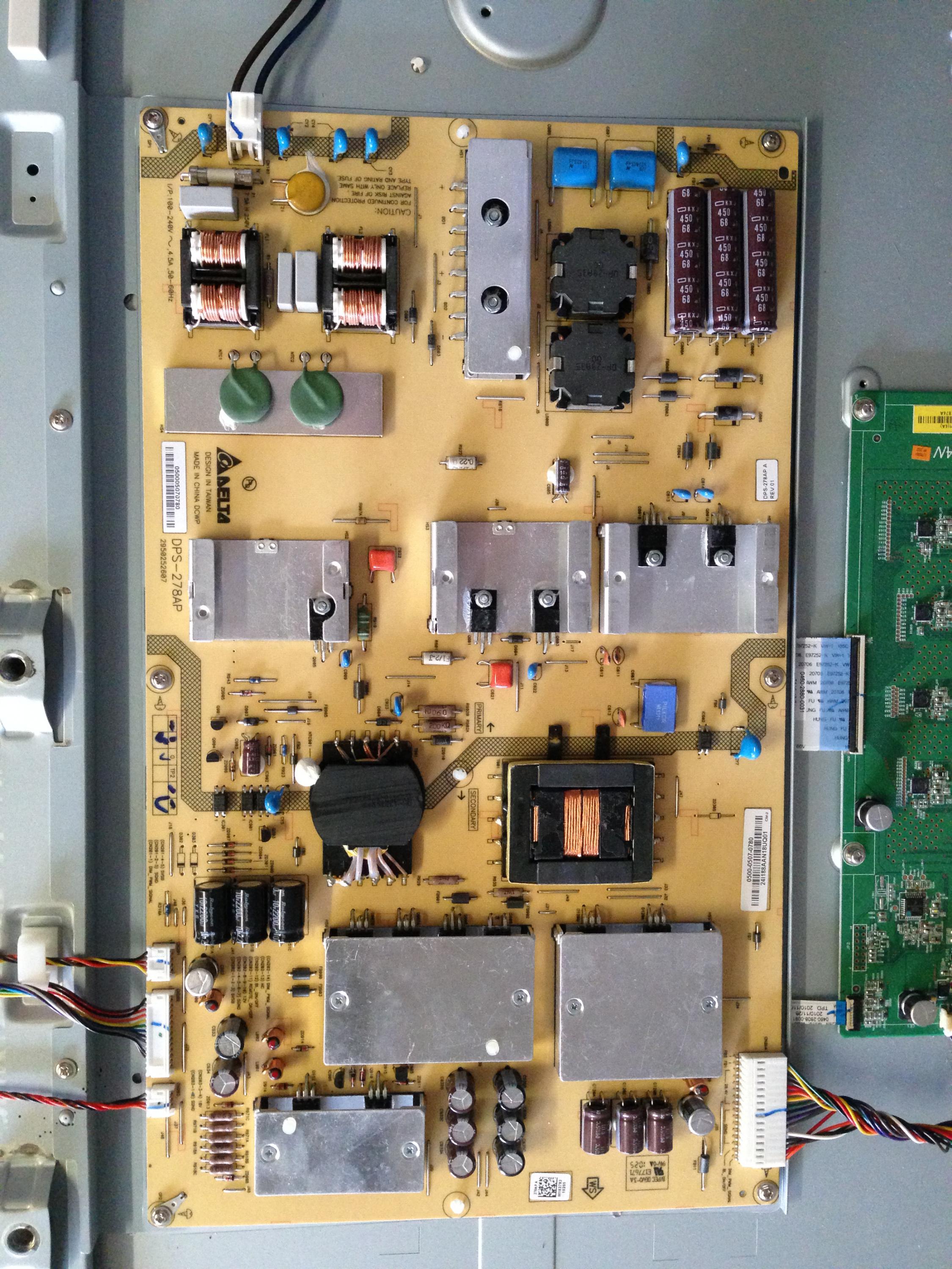 Open the tv up and take pictures of each board individually, one up close of each connector on the power supply board so we can see any markings and one of the entire back of the set.