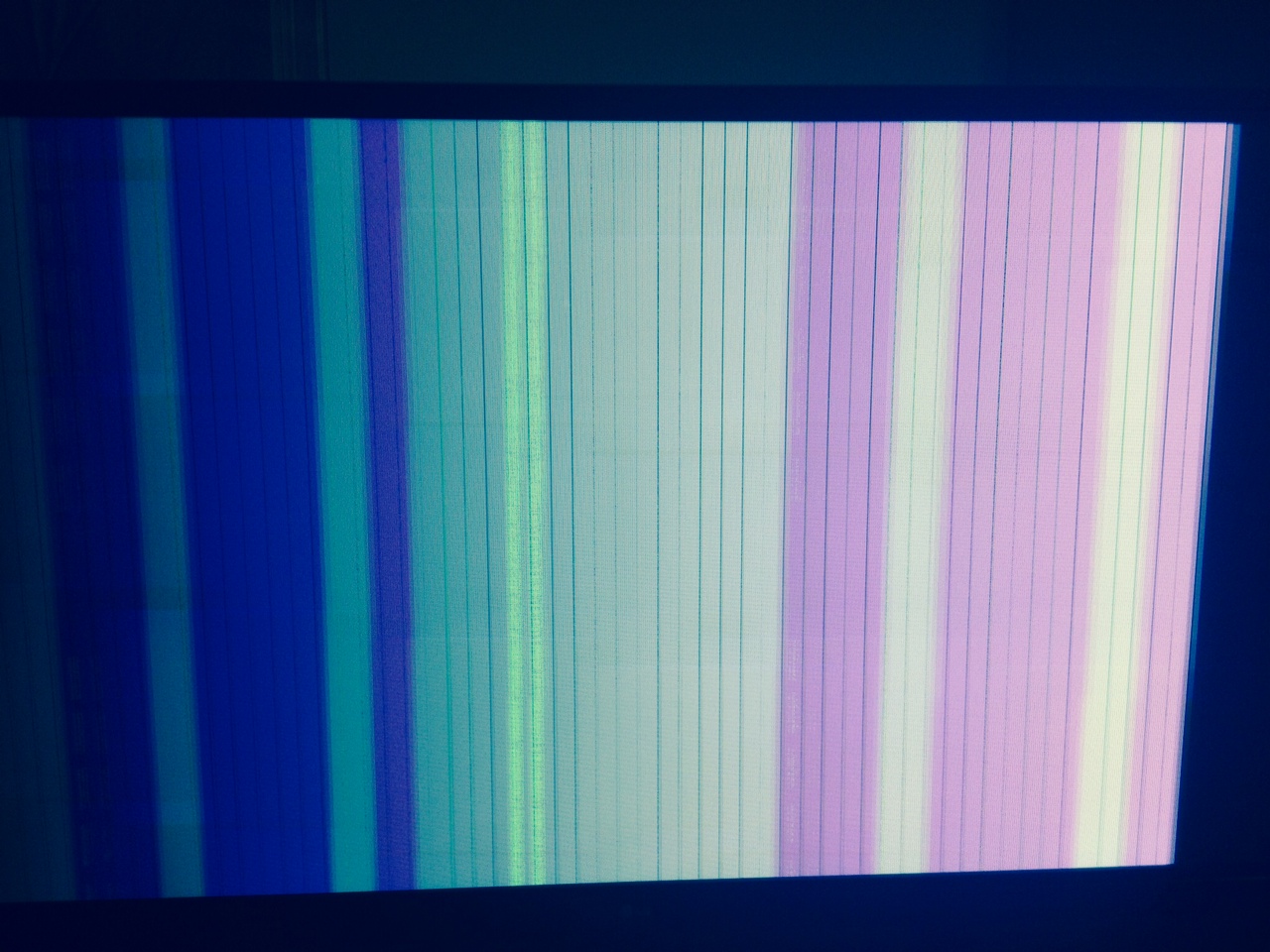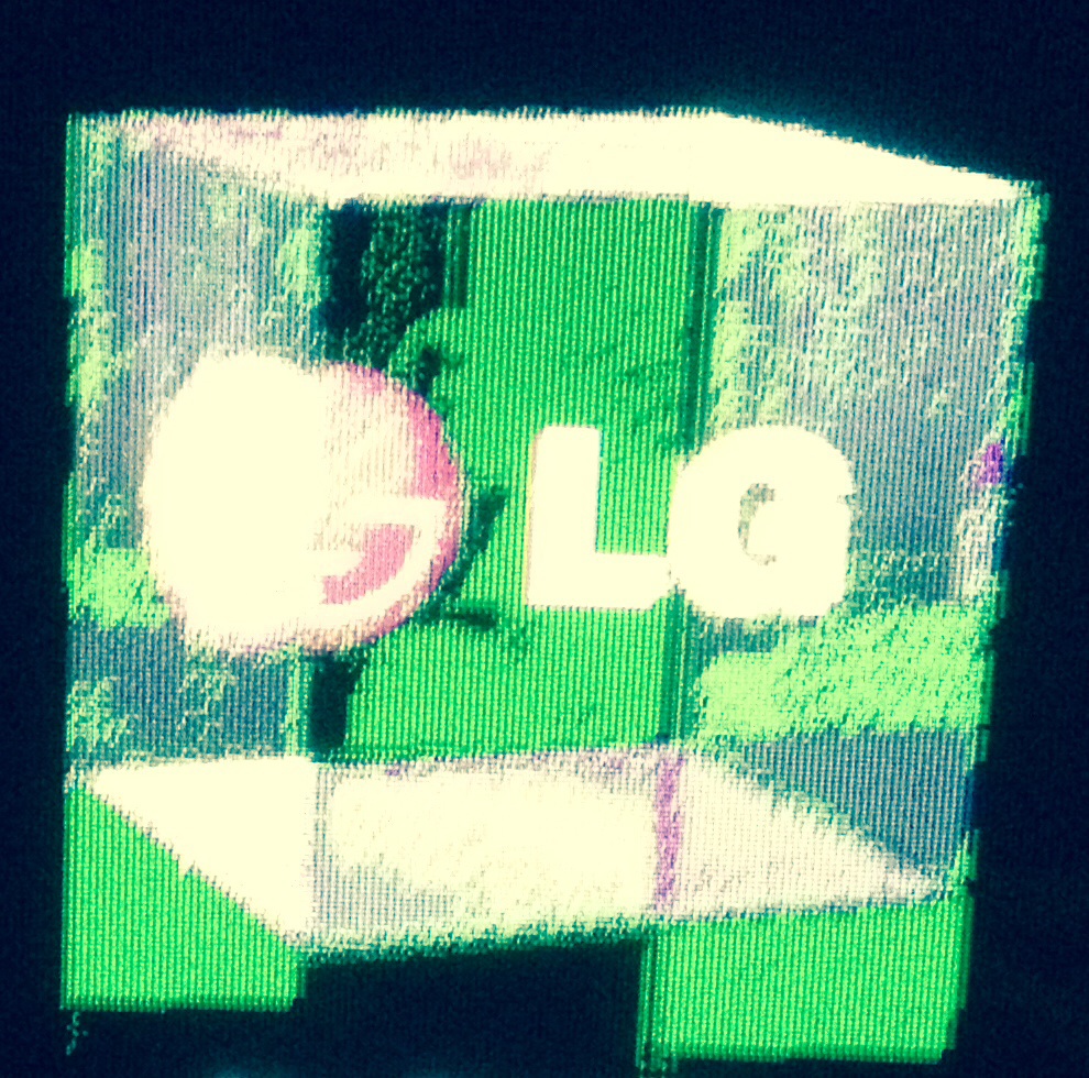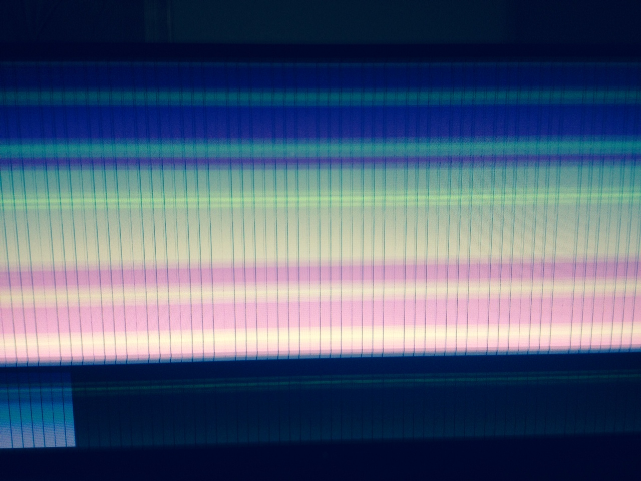 Dark or shined stuff appears green while bright and whites appear pink, there're evenly spaced thin black vertical lines, every second line is less pronounced. I'll let my picture explain the rest, please help!
