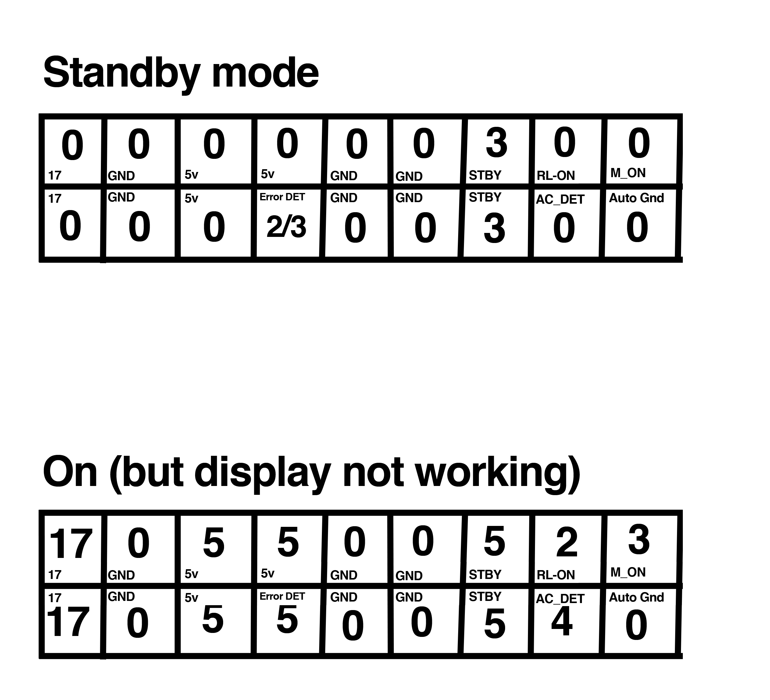 Attached is a pic I made that documents the voltages I get coming off of the power board going to the main board. I used a needle as my positive probe and probed the pins in the jack itself so I could leave it connected. Does any of this information tell you anything? the 2/3v on Error_Det indicates that it was flickering between 3 and 4 v. I also took similar notes on all the other jacks coming off of the power board going to the Ysus Zsus and logic boards if that information would be useful.