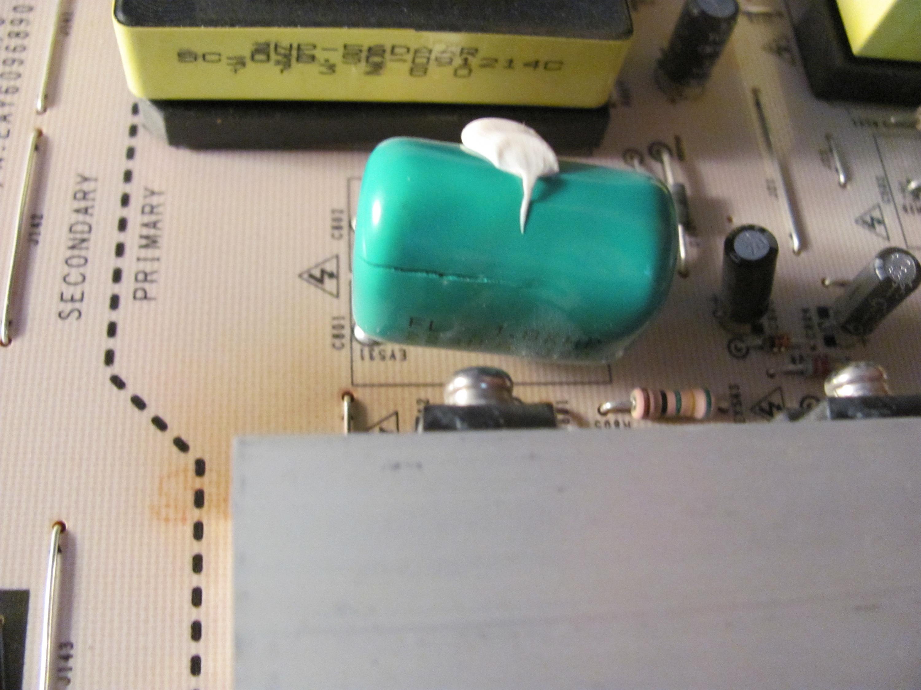 That cyan color component is a mylar non polarizrd capacitor. Can you take a close up pic of the voltage regulator? These LG power supplies are hard on these regulators. I have one here now with a shorted regulator. Different model same scenario.