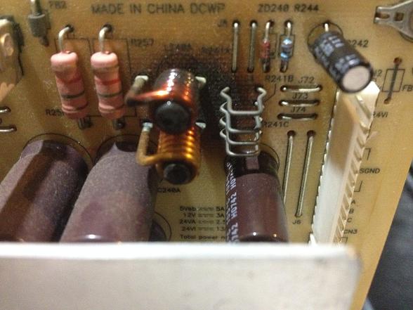 Nasty burnt area of PCB on the top left corner of the Power Supply (Should I say PSU from here out?) that is beneath cap CY5 (determined from looking at one of the other power supplies).