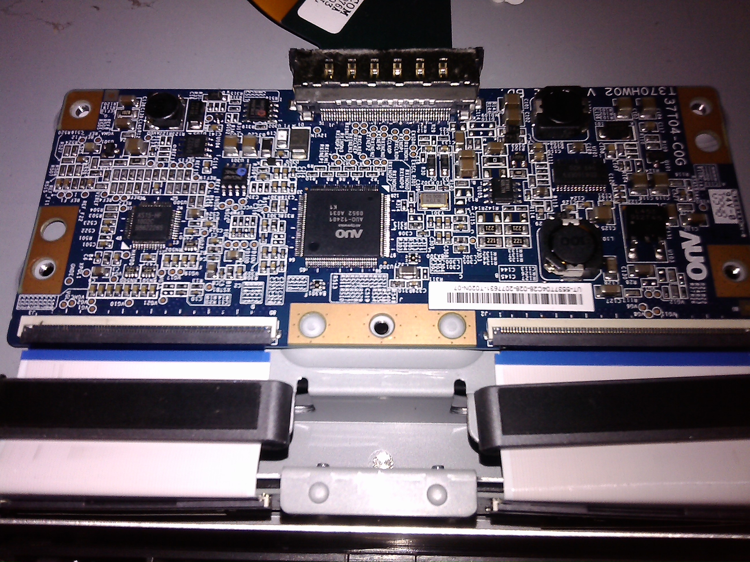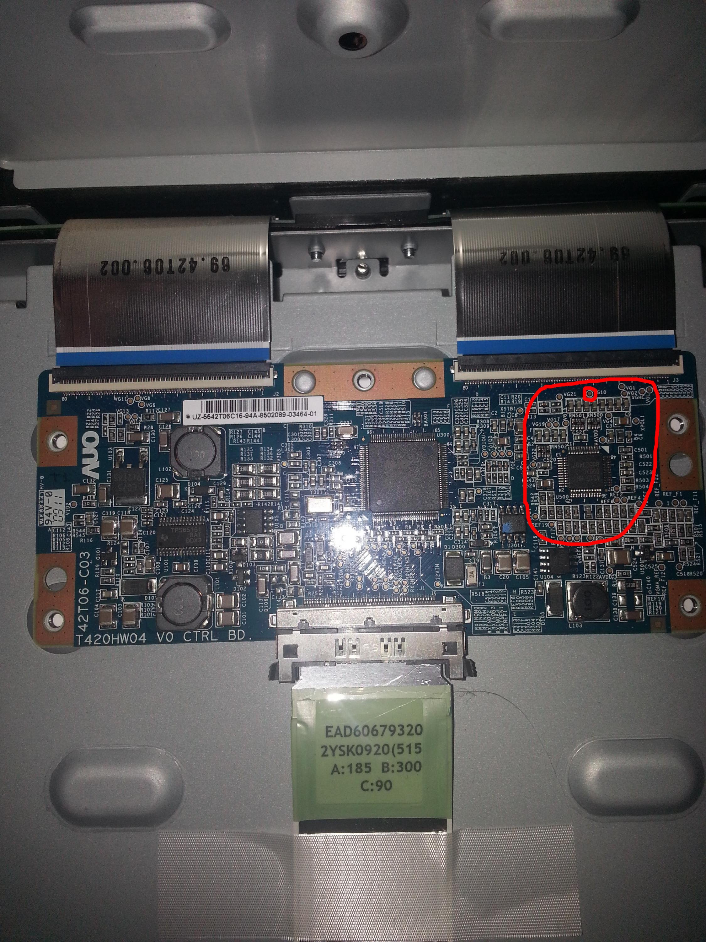 a friend of mine gave me this TV to fix, with common SAMSUNG TV issue - damaged panel. Turning on, sound is present, but no picture. So I went directly to standard process, connecting two pads together with a wire ( see in the picture ), and then removing flex cables. With right flex connected, there was half screen working, but still no picture ( disappearing colors and similar weird stuff ) + working sound. With left flex connected, TV is restarting + working sound. I supposed, left side is damaged, so I then blocked all 8 CLK pins ( going from 0R resistors on the second...