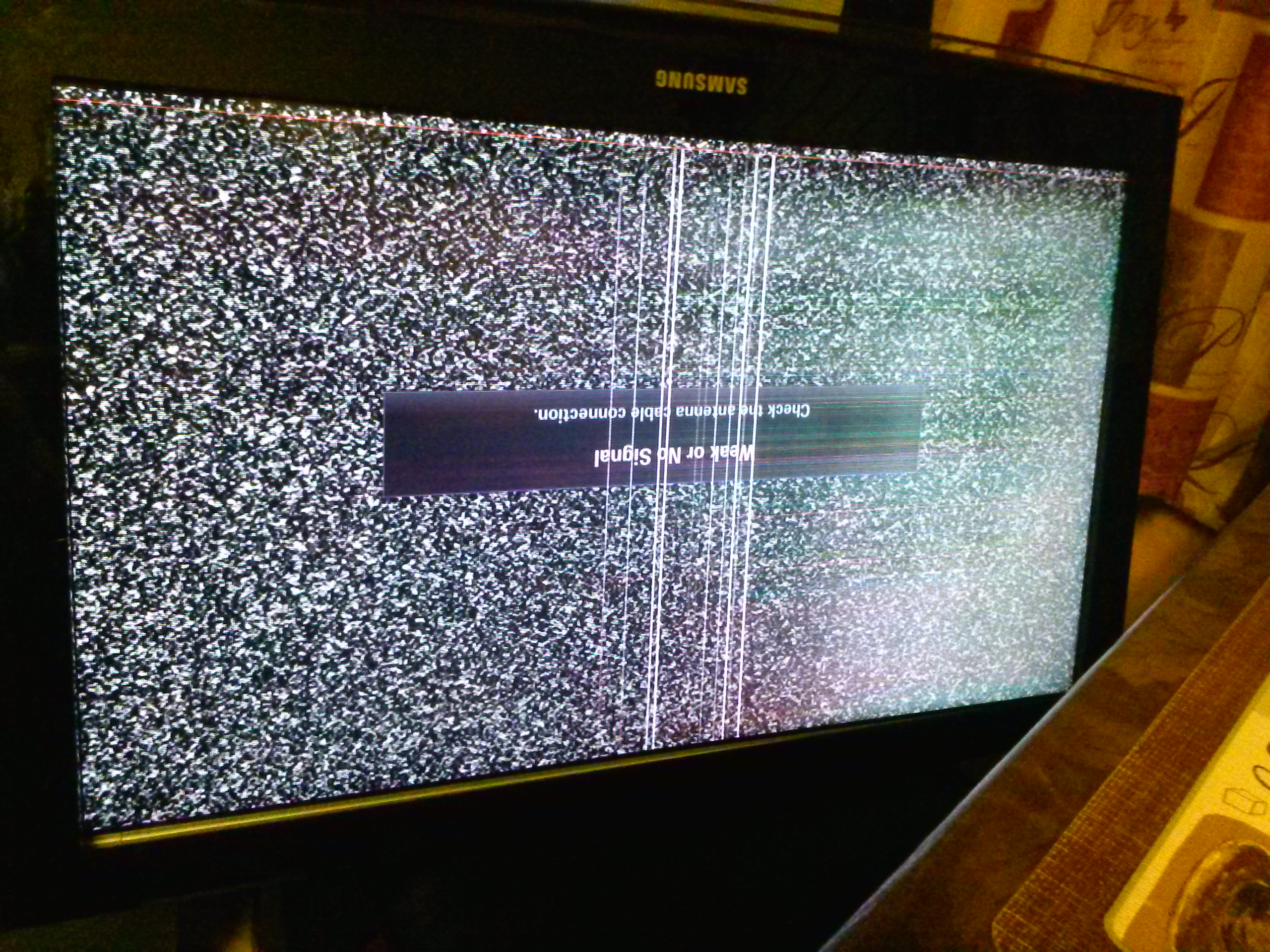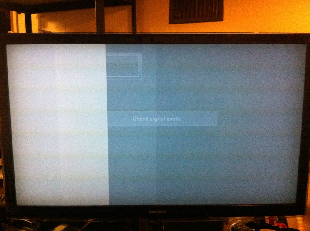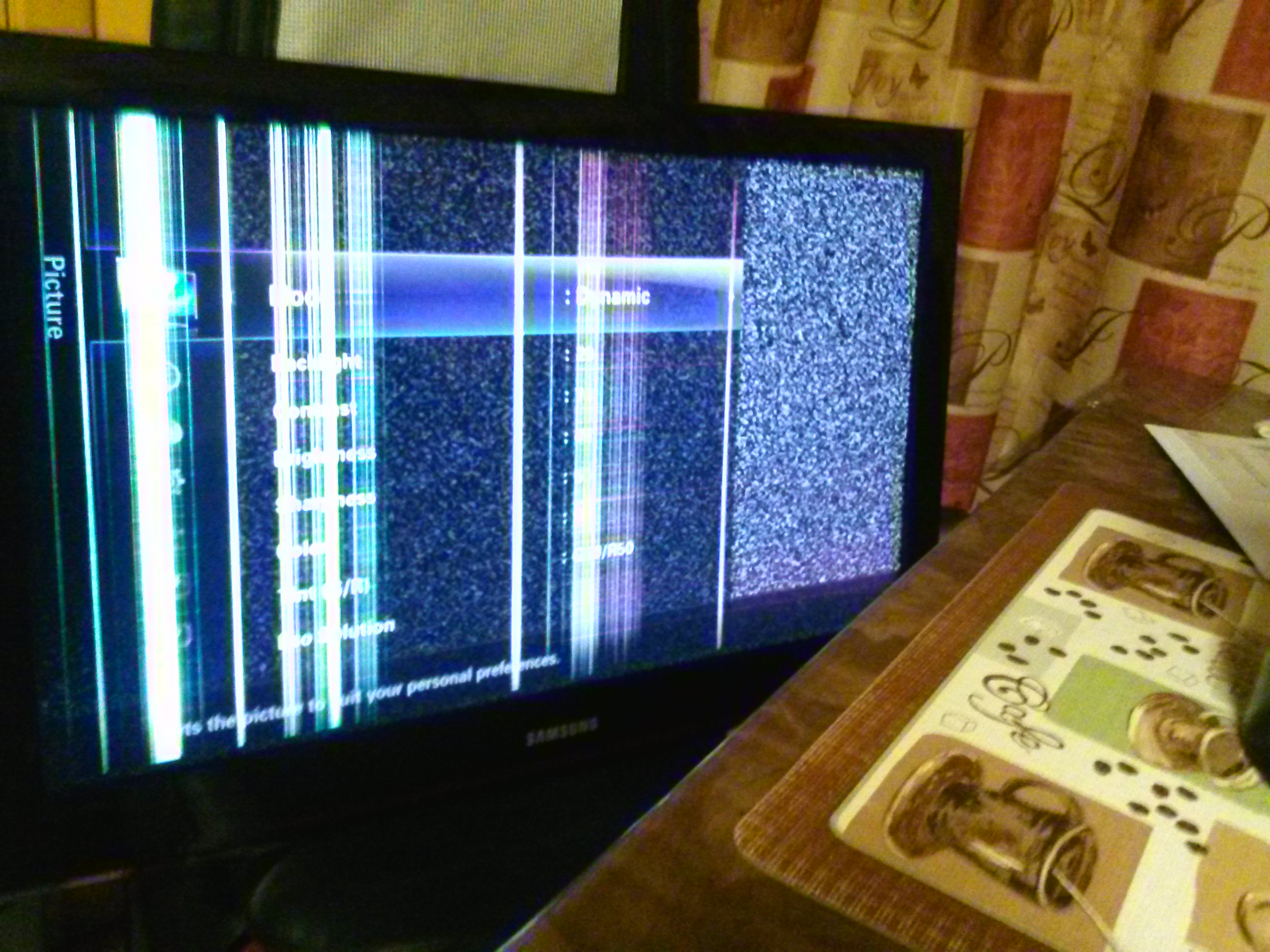 The TV turns on, chimes and all that, then the image comes up - the screen is divided into 6 equaly spaced bands. The first two from the left are two shades of solid white and seem completely opaque. The third is still pretty bright, but text is visible. The second half of the screen is also washed out, but the vertical bands are harder to notice. They're not quite visible in the video, but I can see them in person..