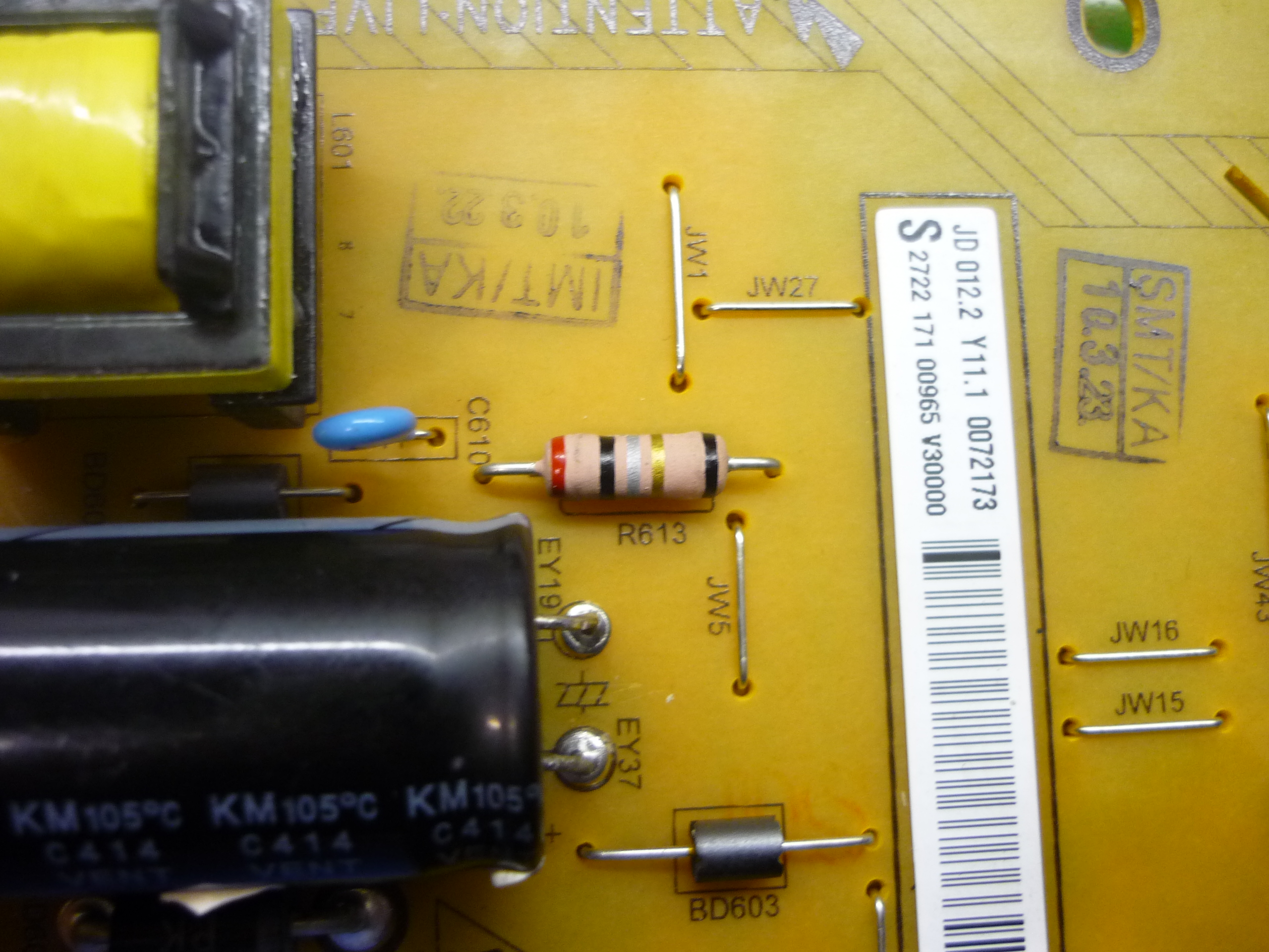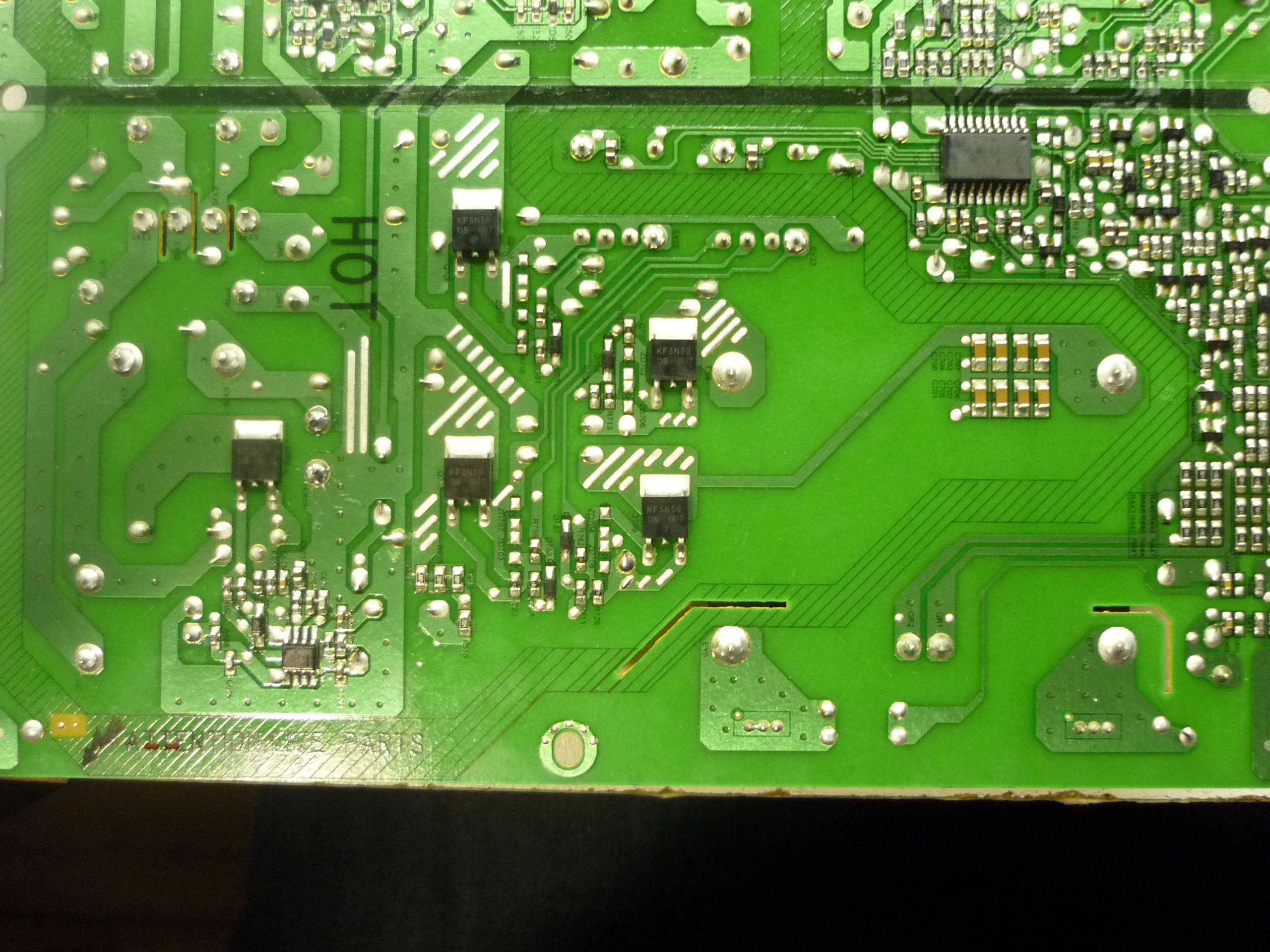 Check R813 does it test as according to colour code? Near big cap. Also, can we have a photo of the bottom of the power board? (the green solder side.)