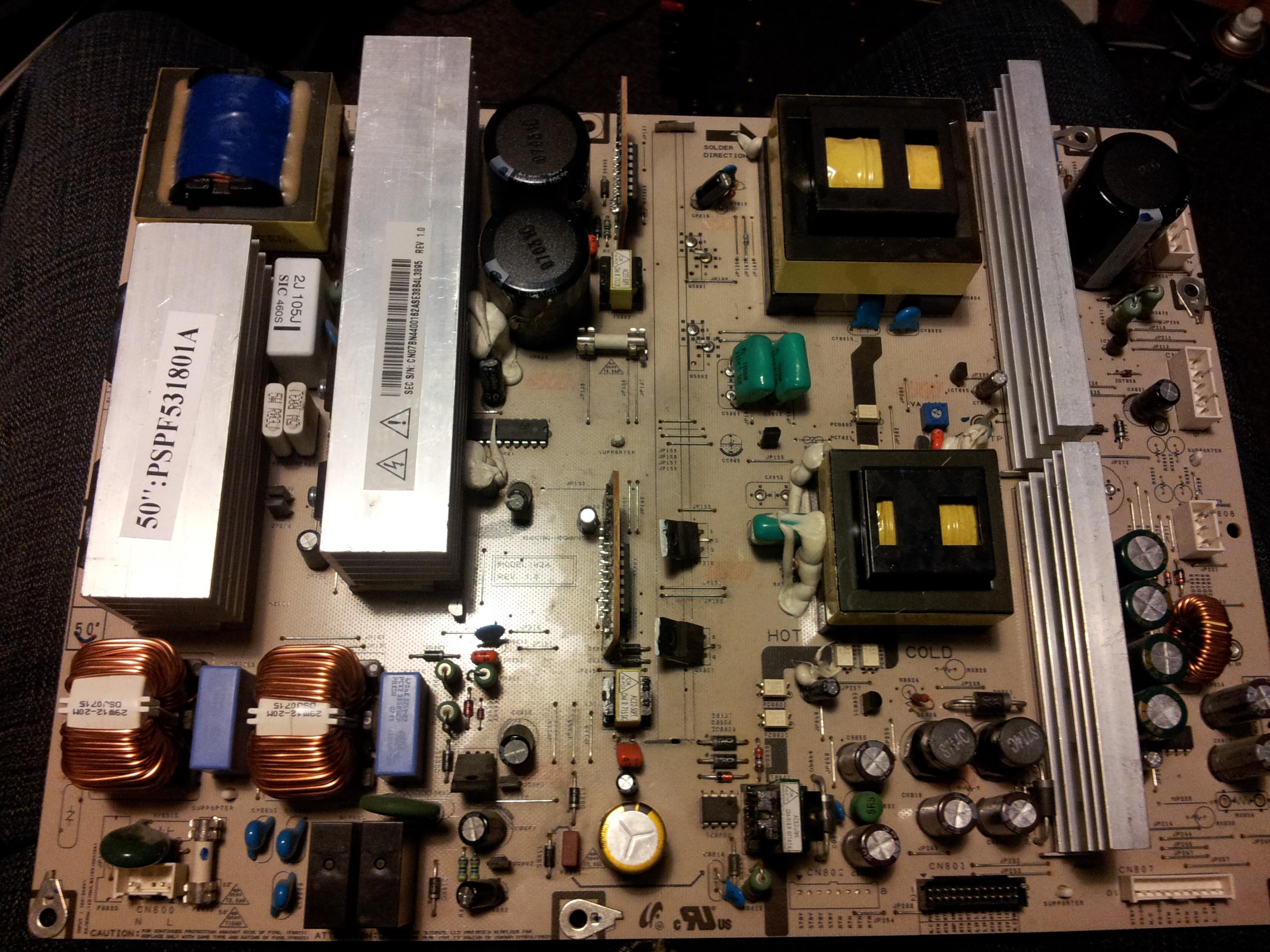 Samsung 50" progress: FETs installed, SMDs done. Only one diode on FET gate drive was bad, but all main components replaced out of caution anyway. (The other diode tested OK out of circuit, so I left it.)