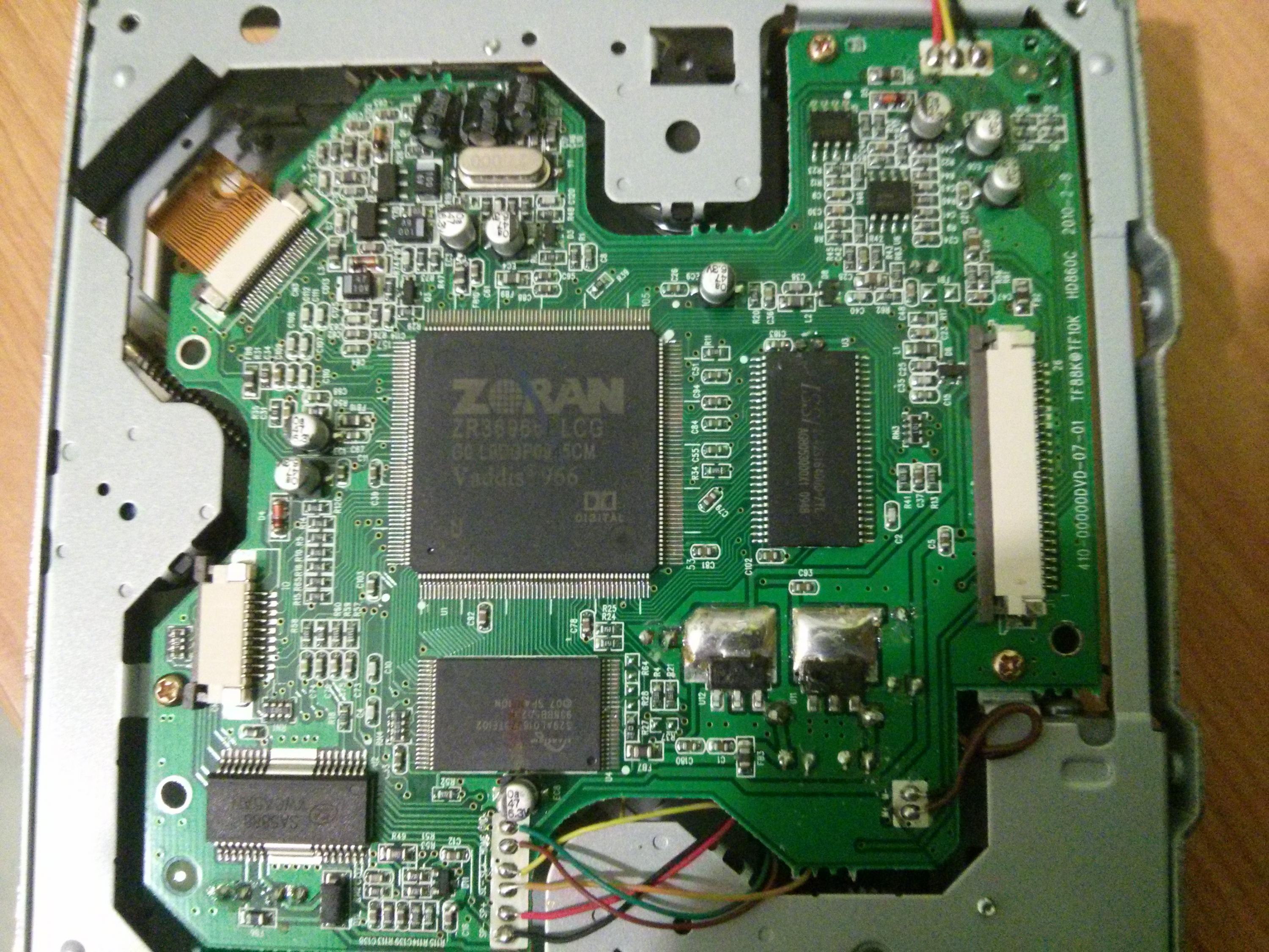 In the "optical board", you can find the main processor which is a Zoran Vaddis 966, and three chips which are called S29AL016J70TFI02 (it's a CMOS 3.0 Volt-only Boot Sector Flash Memory) ,other one is a IC42S16400D-7TL (it's a 64-MBIT SDRAM) and the other one I don't have found any information about it.