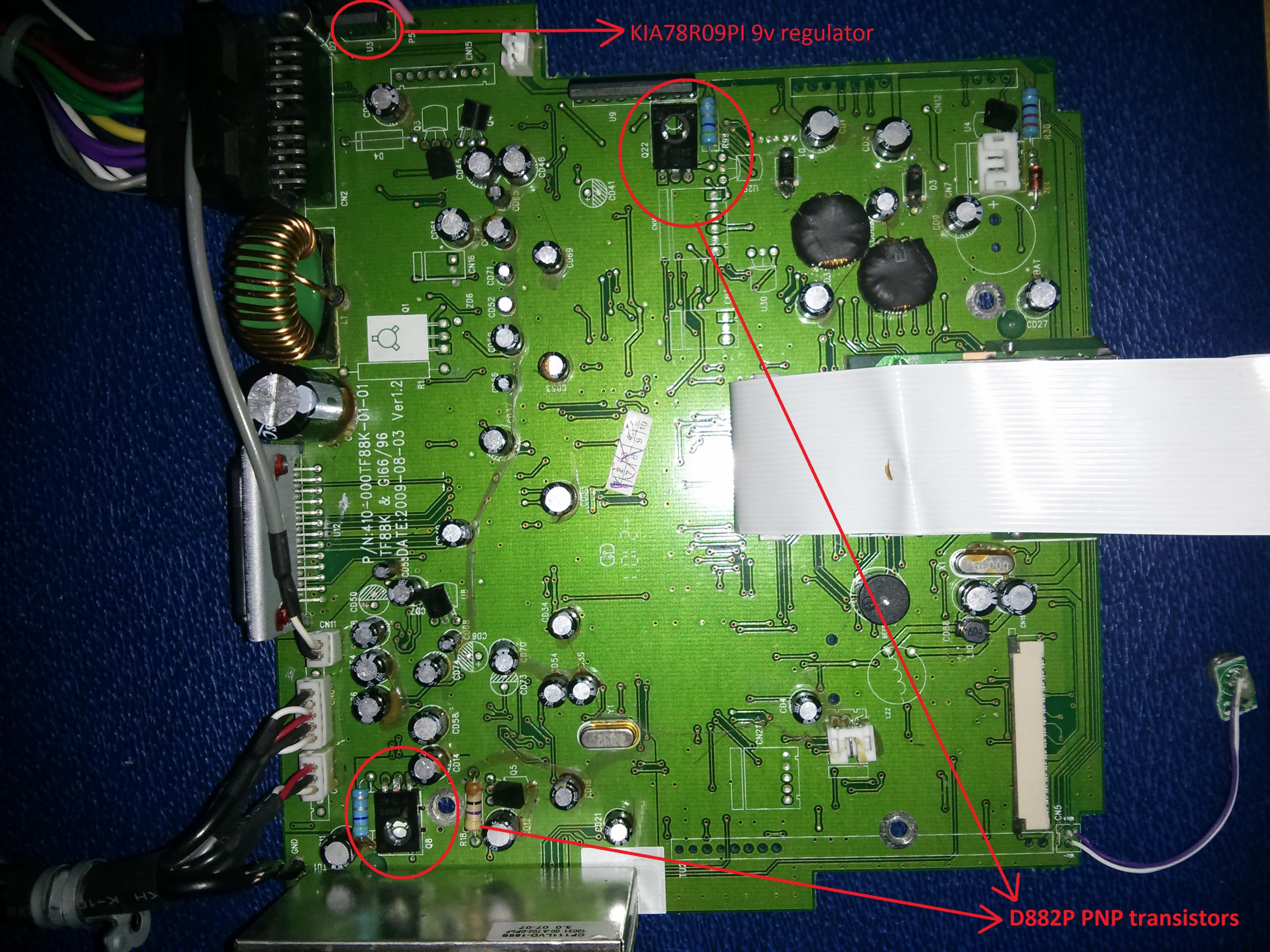 In the main board, I have checked the two D882P PNP transistors and they are good (I have desoldered and resoldered them). I have checked the KIA78R09PI 9v regulator which is good too (measuring voltages).