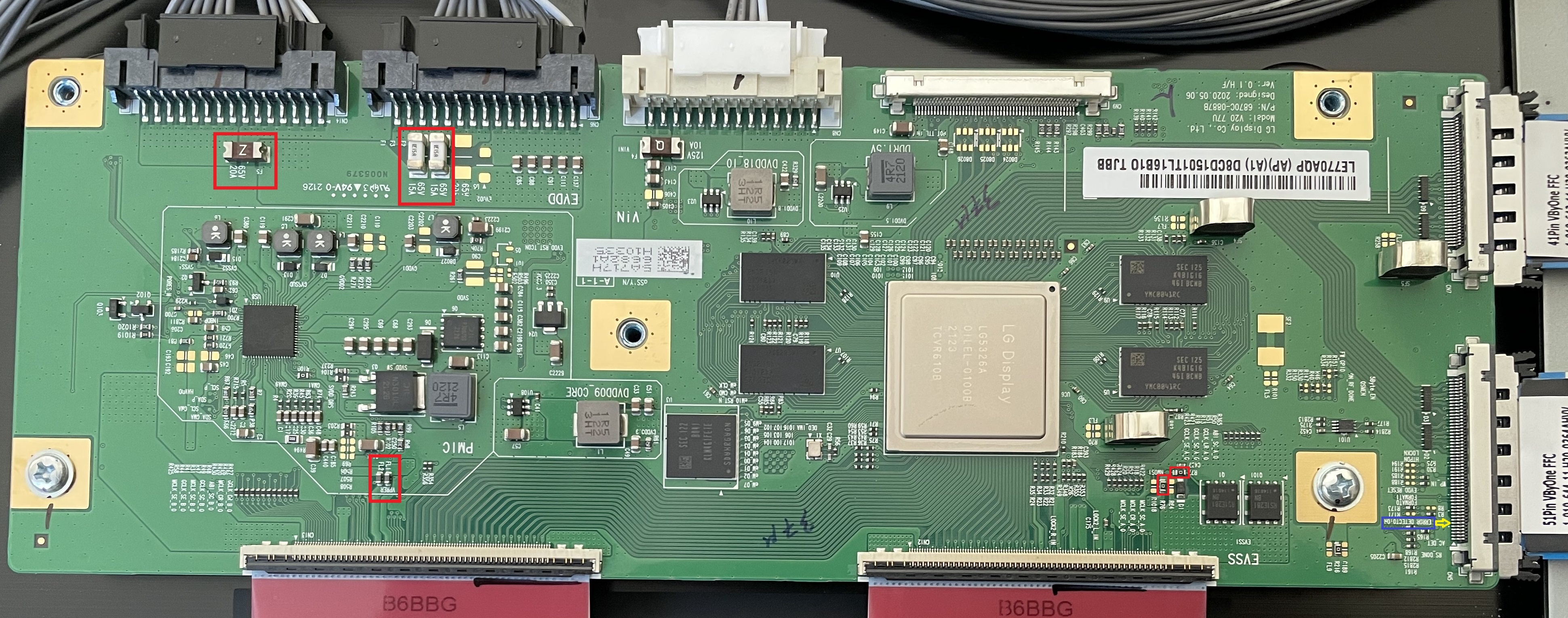 I don't know if I should be concerned with the fact that TCON_12V is a bit high, but I proceeded to the next step which was to leave pins 1, 3, 5 and 6 connected, unplug the cable from socket 6401 at the main board, disconnect both LVDS cables from the TCON board, and plug in the TV. I expected the screen to come on and show me something that might help me to determine if the problem was in the display, but the screen remained dark.