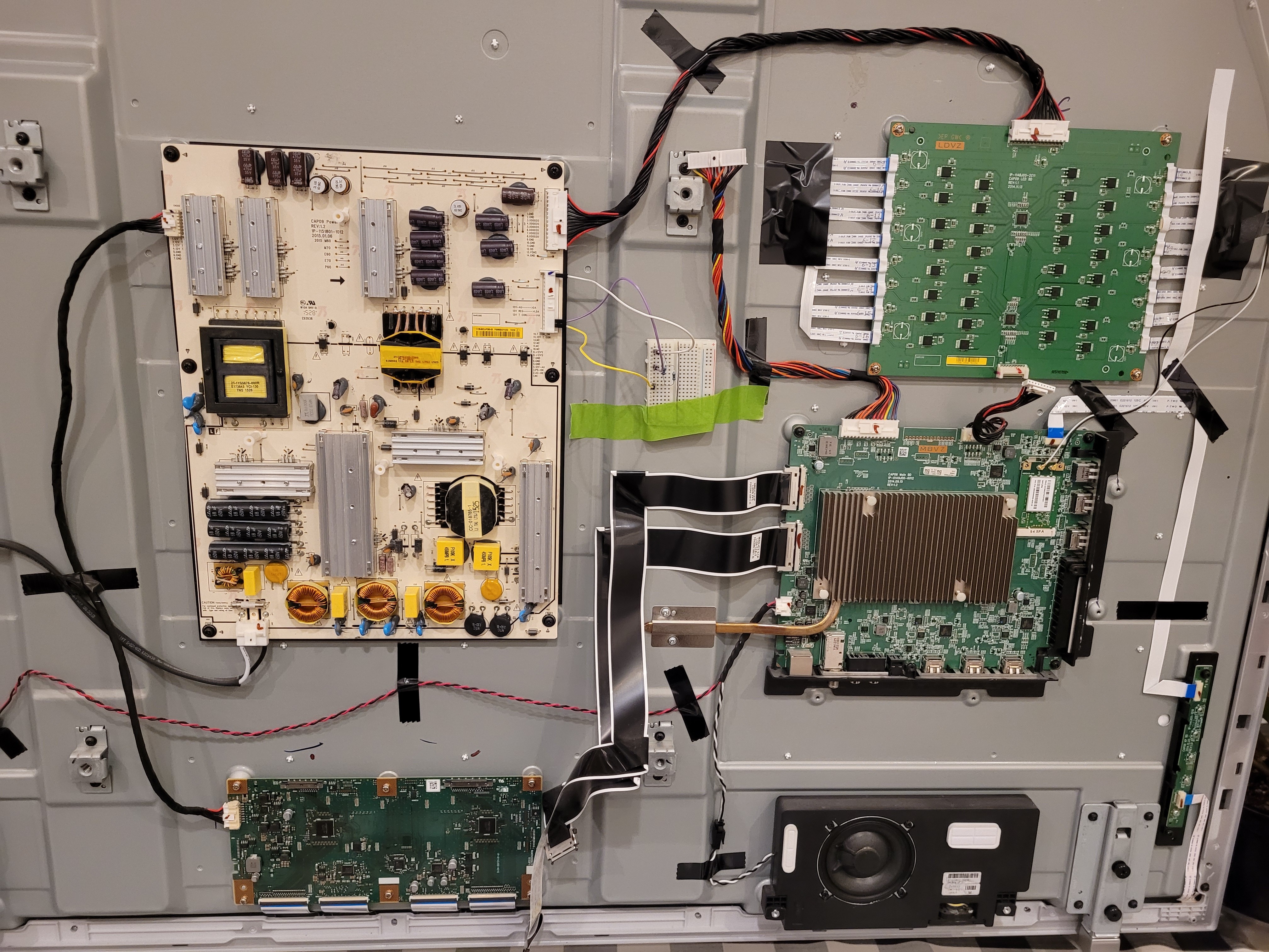 The one thing that is strange to me is on the top left connector (CN202). Pins 1-4 (12V T CON) were always showing 0v, even when powered on. Even if I unplugged the cable from the power supply board. Except for one time. At one time during my testing, I could see that the screen had come on, displaying the half white fuzziness from before. During this time, I was reading 12vs on pins 1-4 on that CN202 connector. I can't tell if this means the TCON board is going bad, or if this is still a main board issue, which I was suspecting up until this point.