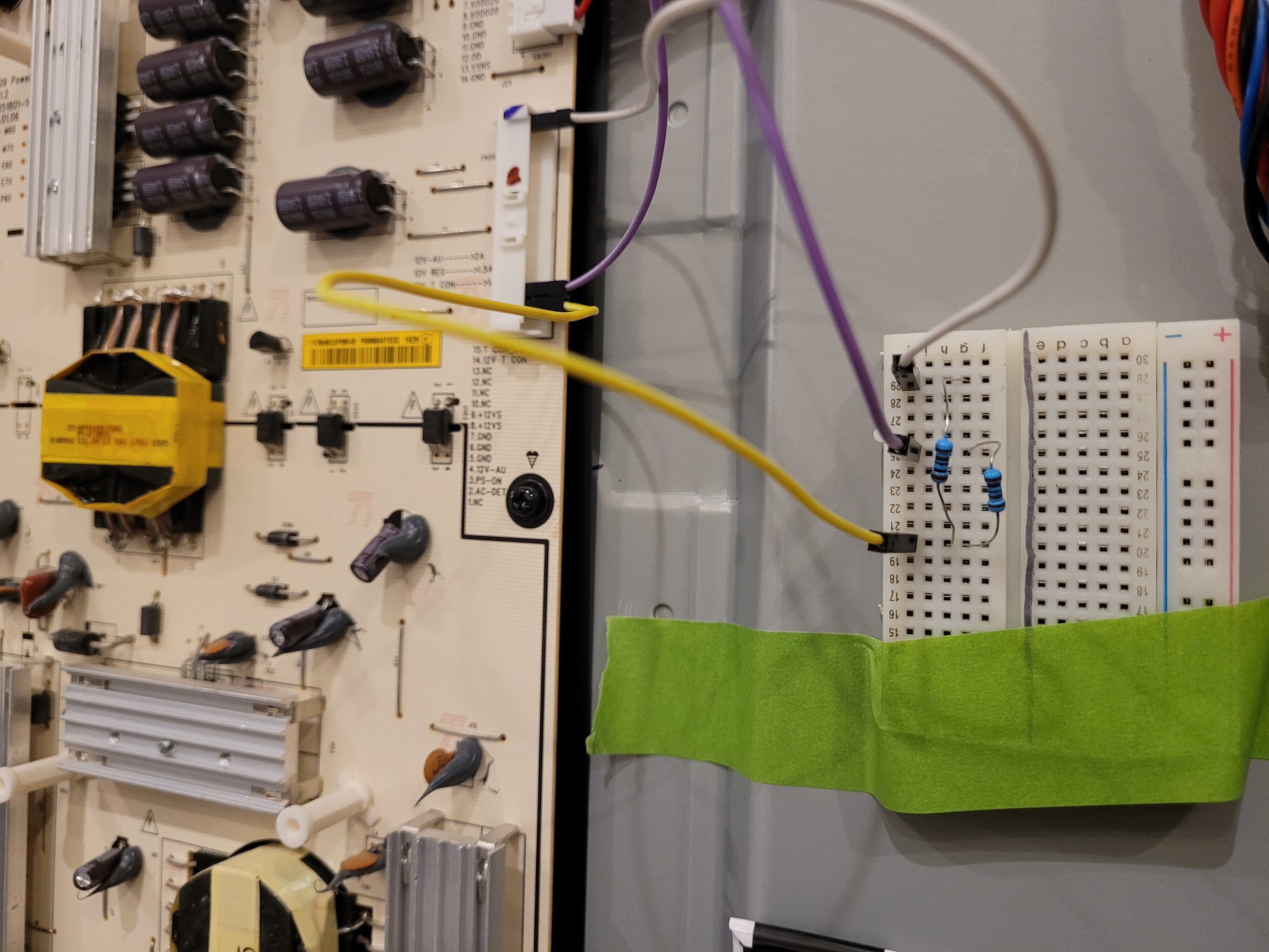 we will slide out ( take it out from circuit ) the wire of pin 15 " TCON_ON) from the sockets isolate it so no short will be to chassis..