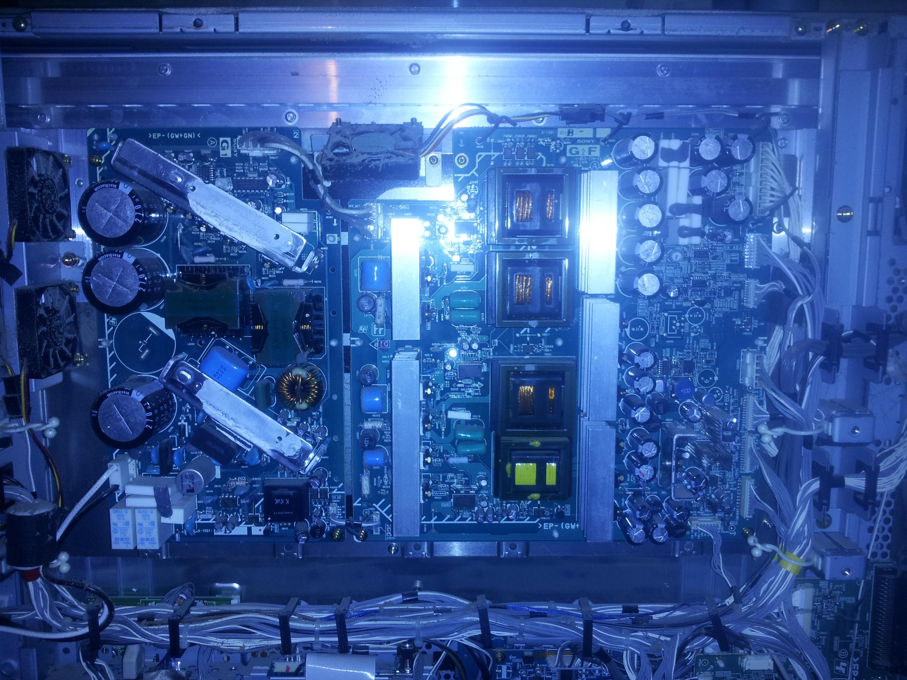 Ok so i got this sony 50in and when i plug it in I get 12 grn flashes and the screen does not come on. I pulled off the back and started testing voltages starting with the g1 board, now the top right plug is labeled PFC out (380v) when testing the voltage i get 321.1 volts and the other pin labeled PRI-VCC1 (120v) tested i get 39v to 41v. That indicates this board is not working right? well what can i do to get this thing working besides buy a new board? Any help would be apreciated.