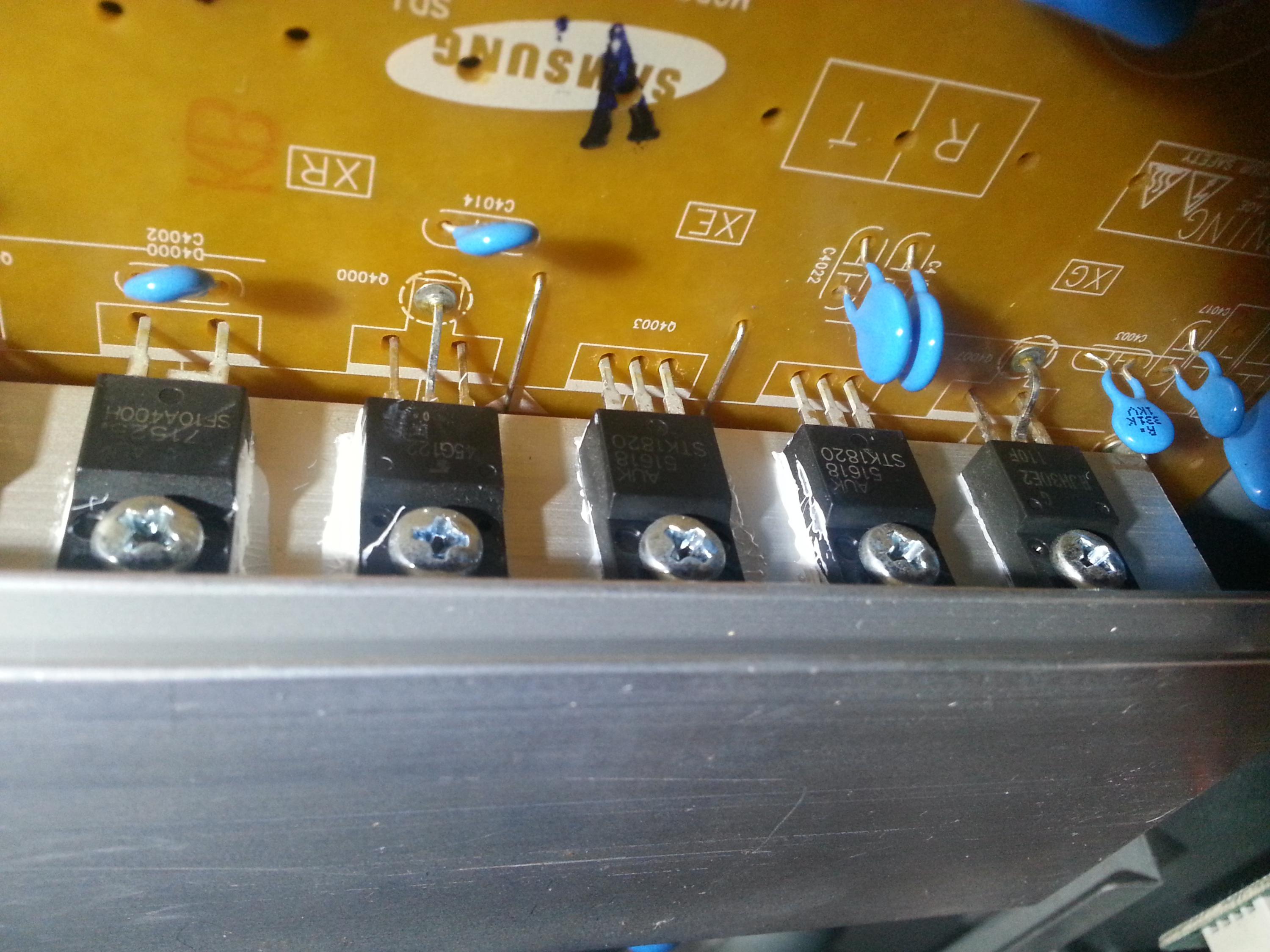 Check each of the transistors on the heatsink - though the very fact the voltages drop out when it is connected is indicative of a fault and the board should be replaced.