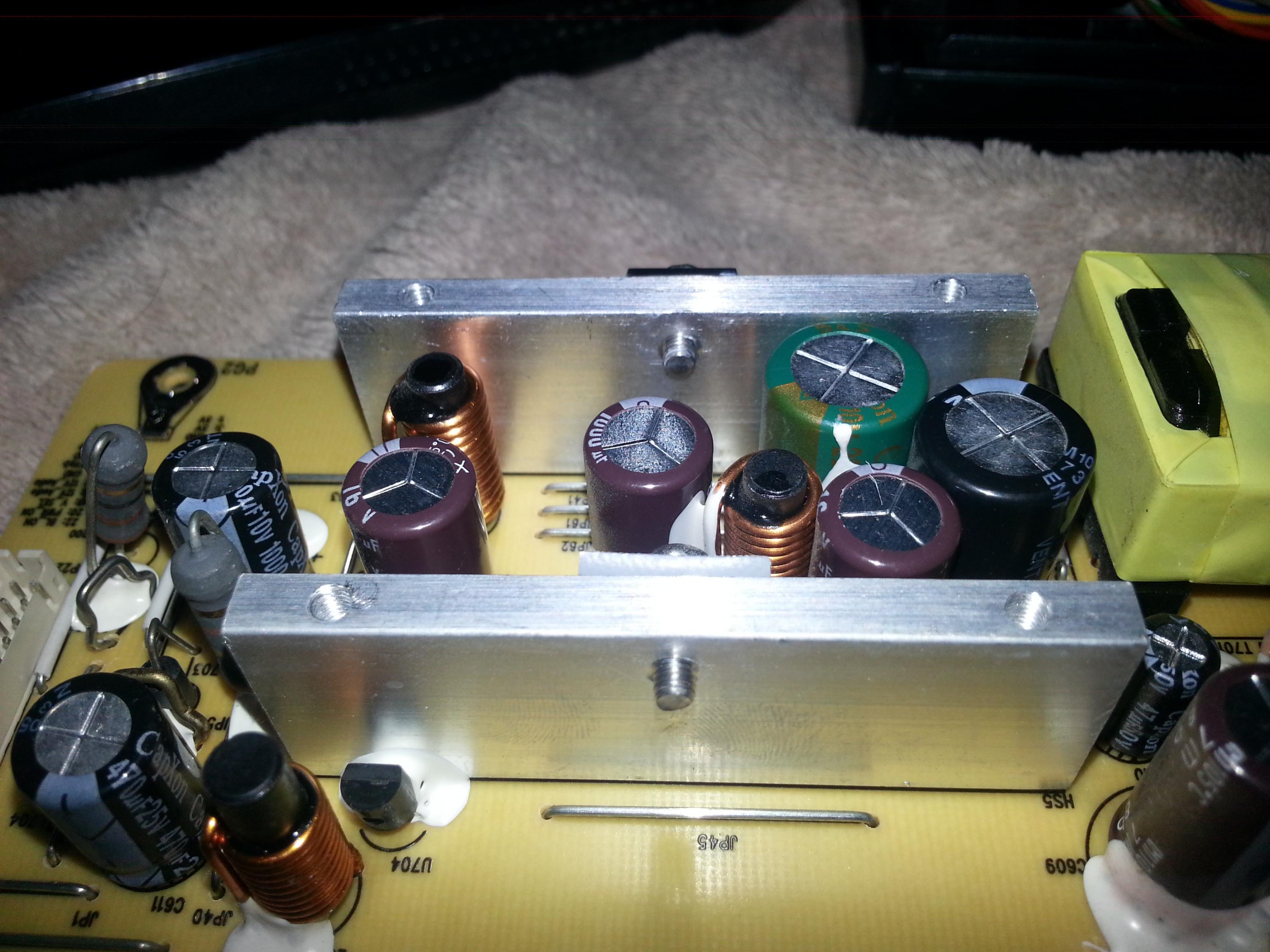 You need to replace with good quality caps panasonic fr fm or fc or nichicon or rubycon equivalents bought from a good supplier. Caps from radioshack are not suitable for this purpose and there are many fakes on ebay.Please upload pictures using attachment function when ask for help on the repair