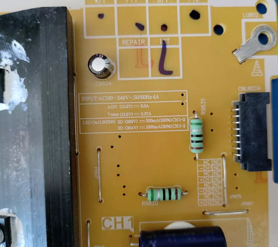 got my hands on a Samsung UE60JU6800K, initially it apparently had a bunch of white circles on screen which I confirmed was due to loose diffusers when I opened the set up and found a mountain of them at the bottom. The person I got if from stored the TV unused for a lengthy period after this so when I got it the backlight was completely gone. I took out the strips and almost all of the LED's have a crack on the yellow phosphor form the center of the LED outward, the ones that don't have this crack seem to work still (Maybe due to humidity after a long period?). Anyways I went ahead and ordered a new strip but In the meantime I'd like to confirm that the power board for the TV (BN44-00860A) is supplying the correct backlight voltages to ensure that it didn't fry the strip. The board has an Input/Output table for voltages which I'll include as an attachment, the backlight output section contains 2D and 3D which I have no idea what they could be. The two filter capacitors next to the BLU SMPS out have 320VDC on them with no strip attached and the voltage starts to drop slowly until a faint click is heard and the voltage shoots back up to 320VDC and I have checked all surrounding FETs and Diodes, as for output on CH1 and CH2, there is only 1.2VDC after power on, now I know most TV's shut off their BLU output if they do not find a strip, but I'm interested in how this happens, does the power board signal to the main board which turns of it's BLU_ON pin? Is it possible for me to enable the output without a strip attached by forcing the BLU_ON high or will that damage something?