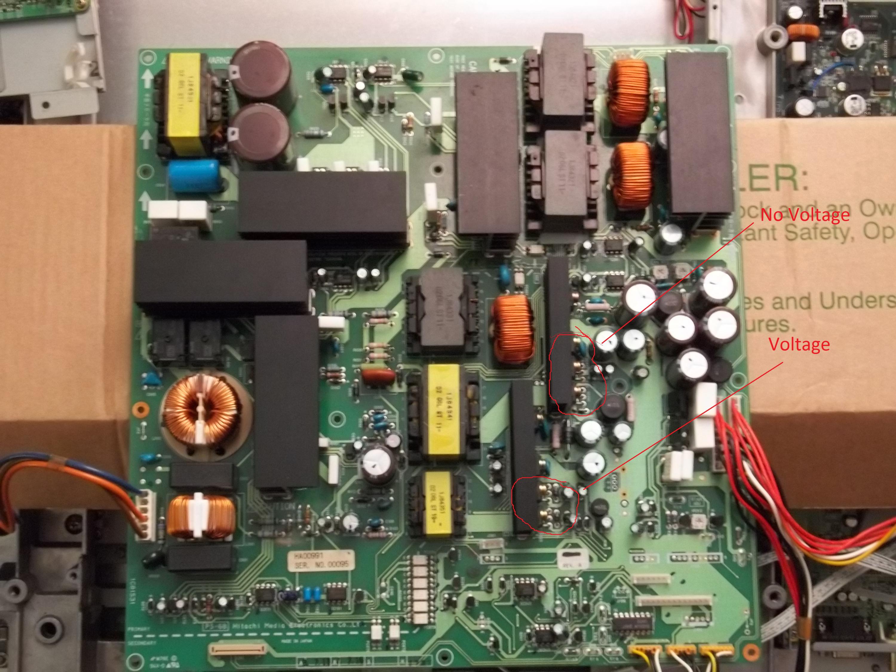 Hitachi 42 plasma. Ill post the number later. I know on the working voltage regulators there was 6 volts on one pin and 3 on another pin. There are 5 pins. The component circled probably is a rectified type diode but the 5 pin ones i think are regulators.Comment