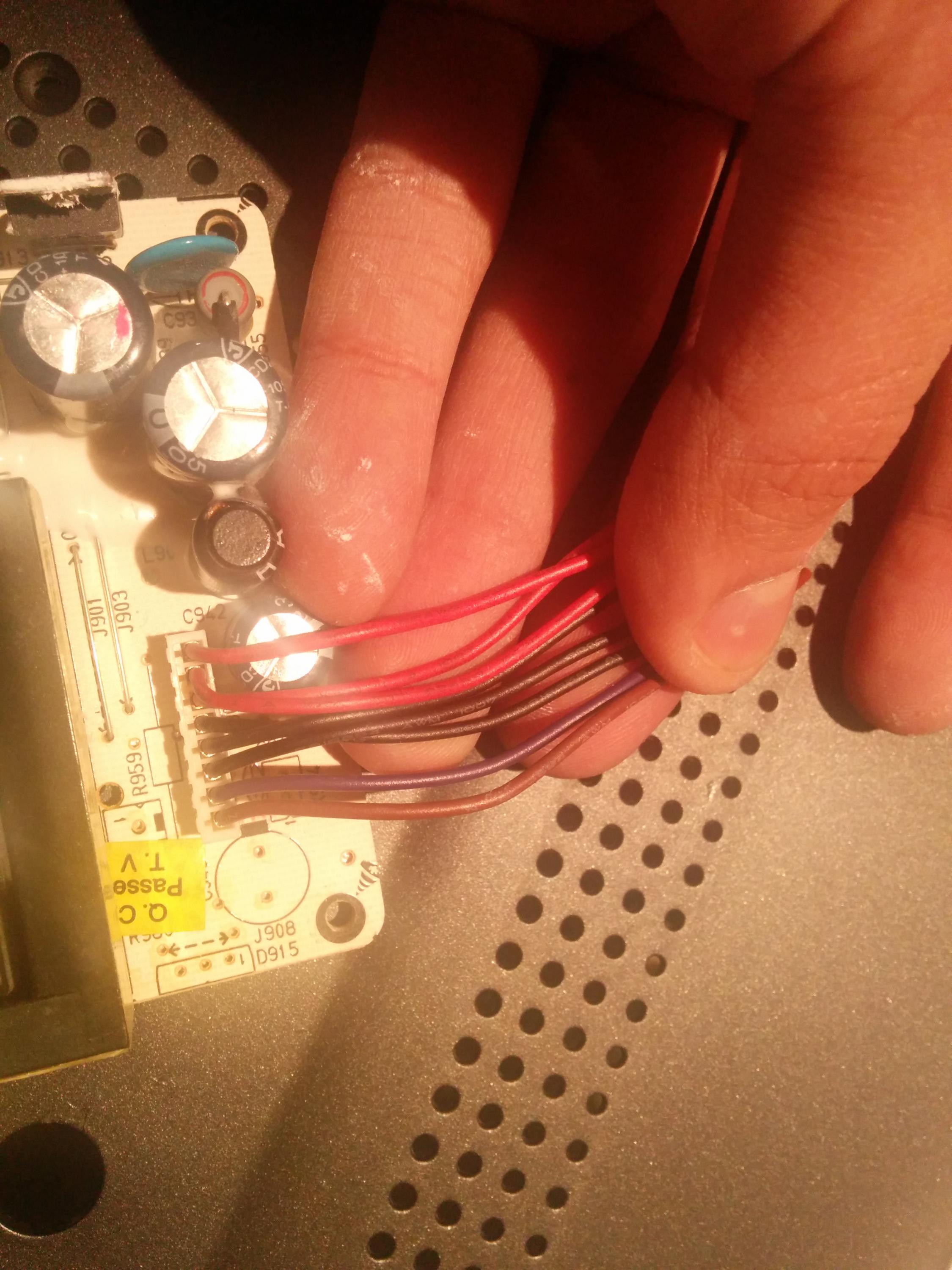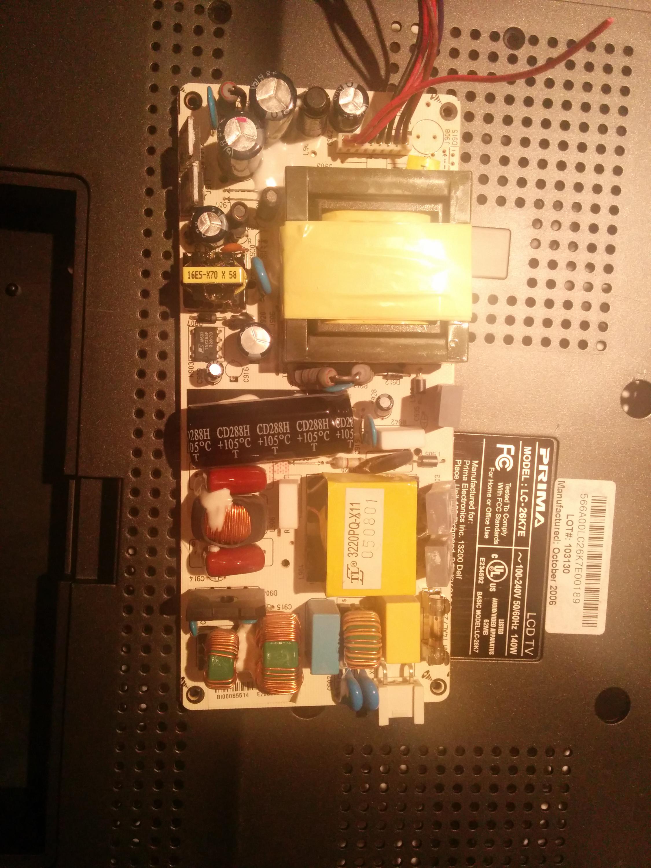 Hi there, i got a prima 26k7e from a friend, said it doesn't power on, thought it would be as simple as a fuse but of course my luck runs thin and 3 components fried so not worth fixing so was asking if anyone know where i can find a replacement or if anyone know the voltages that runs through all of the red wires and if can someone tell me what the brown and purple wire does so i can build one off of another broken tv i have, ill post a picture.