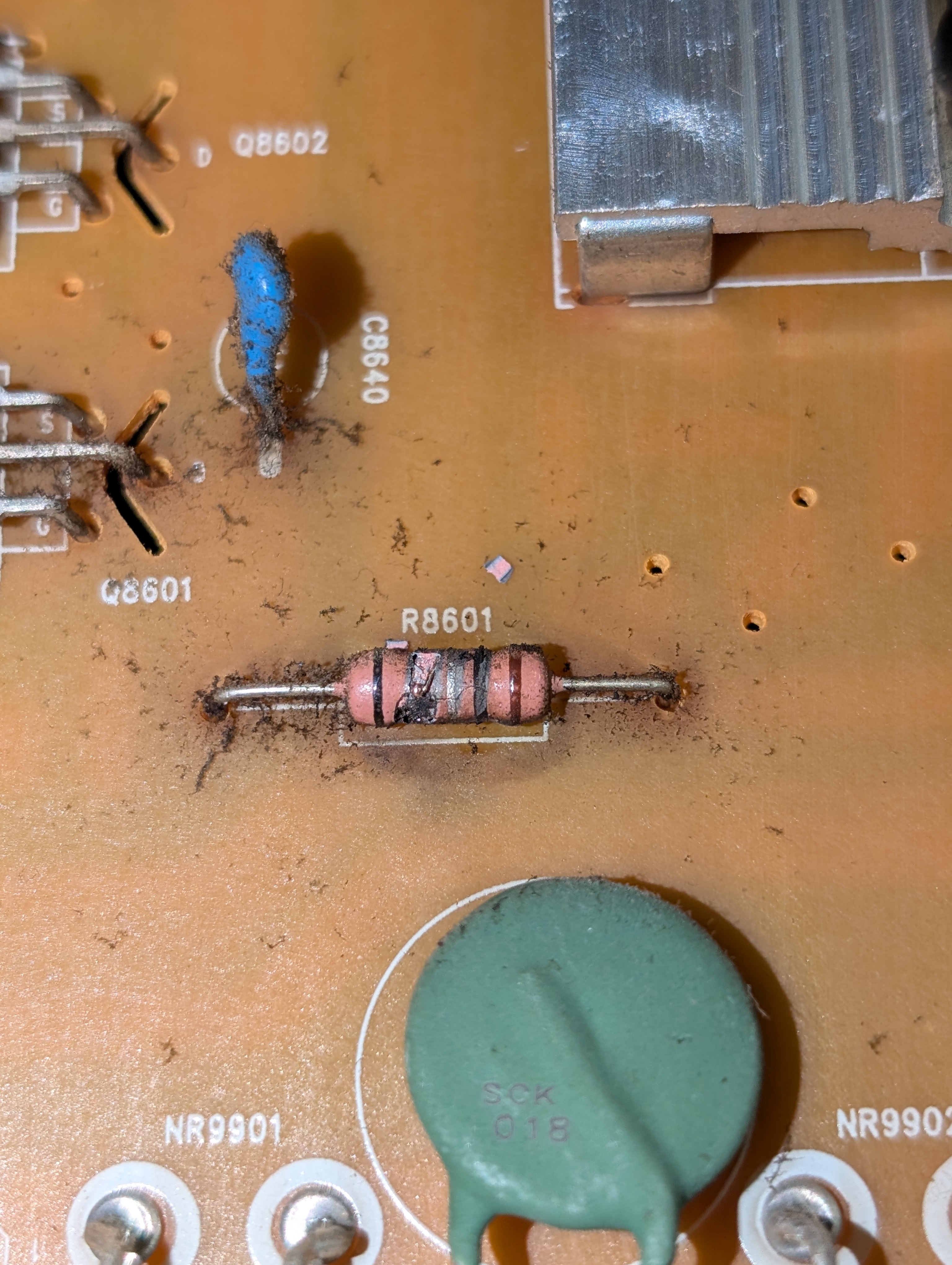 I just picked up this tv yesterday and the previous owner said while watching tv he heard a loud a pop and then the screen went dark. I removed the back cover and found the source rather quickly; resistor R8601. A chunk of the ceramic had blown off exposing the inner wire. Due to the damage I cannot make out the colors of a couple bands. I likewise cannot find a datasheet for the power supply. I tried pulling up pictures of the same board online but the resistors have different colored bands which I half expected as I've had this happen before.