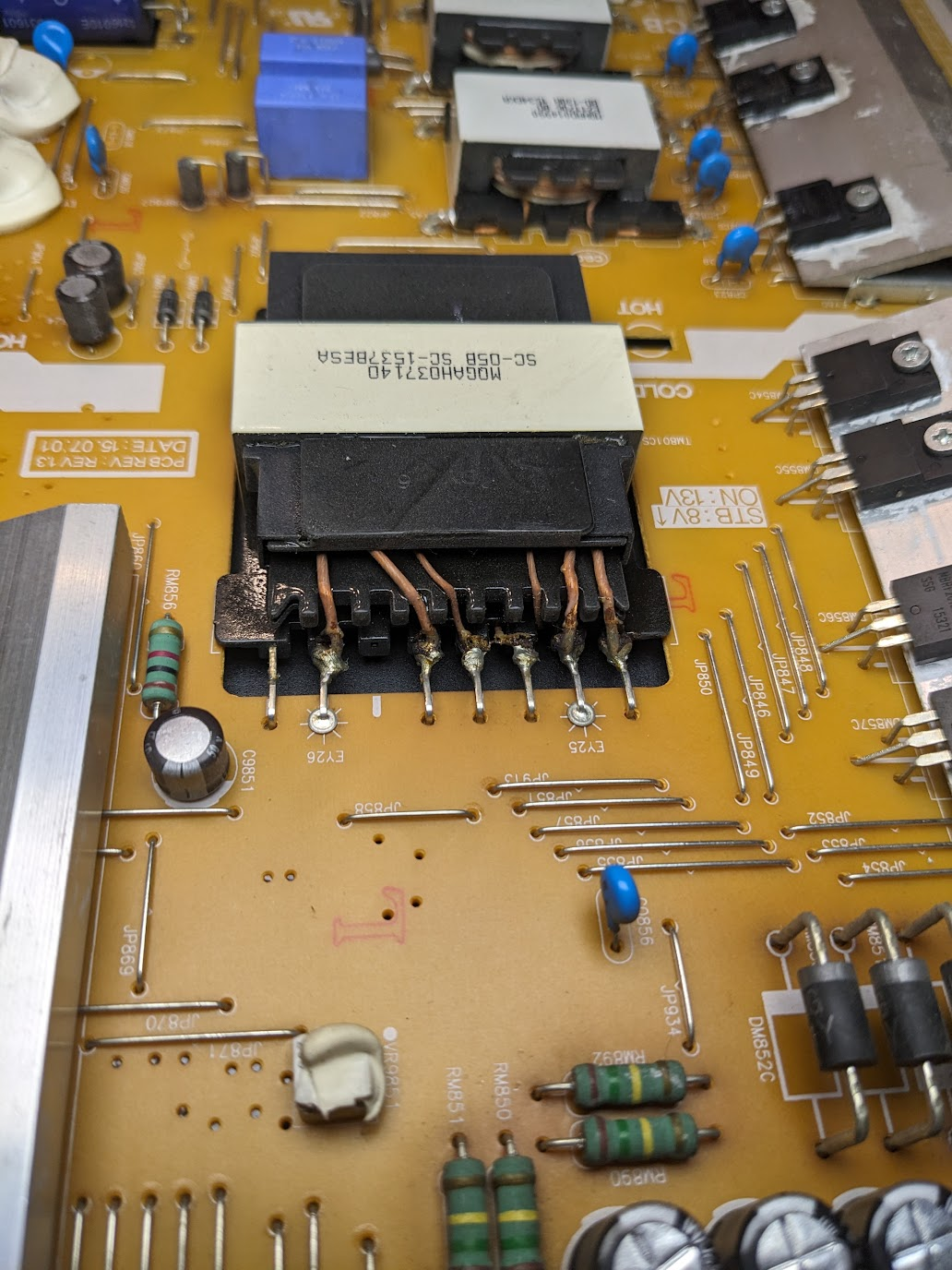 I removed the back panel to see if there were any obvious signs of problems. No capacitors look bulged or popped. All connectors looked good. There are some heat marks on the power board, not scorched, but certainly noticeable.