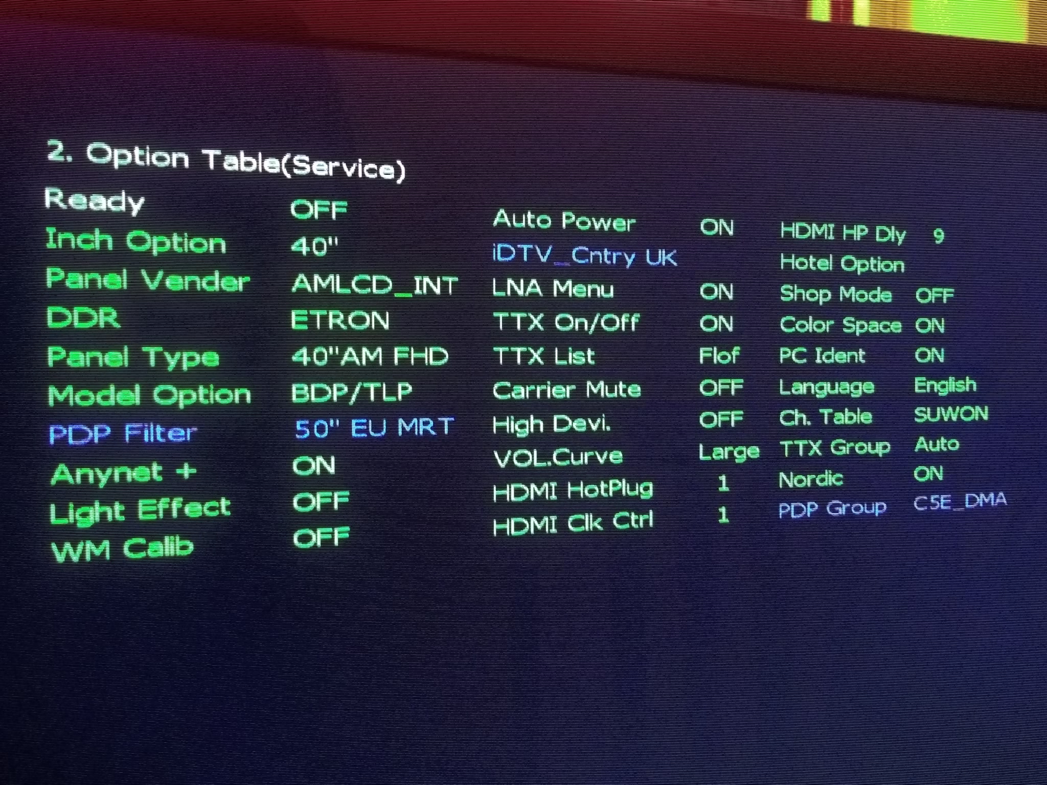 The service mode had been previously modified — possibly by a technician or during the panel swap — and I suspect some key settings are mismatched for the European (Greece) market.