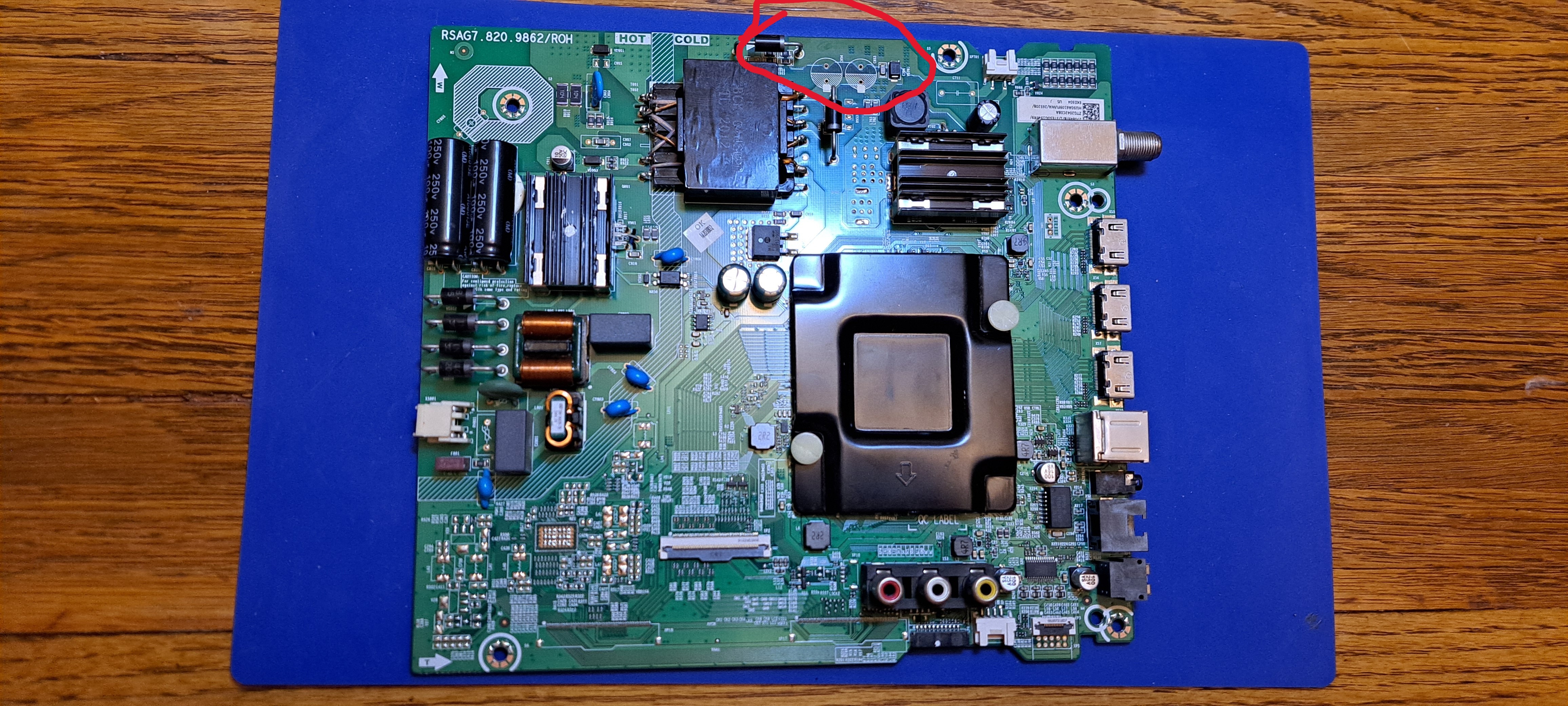 I have a Hisense 55H6570F that gets the the boot loading screen for android and then shuts down. Oddly I hear a crackle on the mainboard as shown in the picture - nothing looks blown. The tv will boot every time, but when it reaches the loading statge of the anroid logo you can hear crackling on the board and it shuts down. What am I looking for (other than buying a new set) ? Inside the square is where I hear the crackling