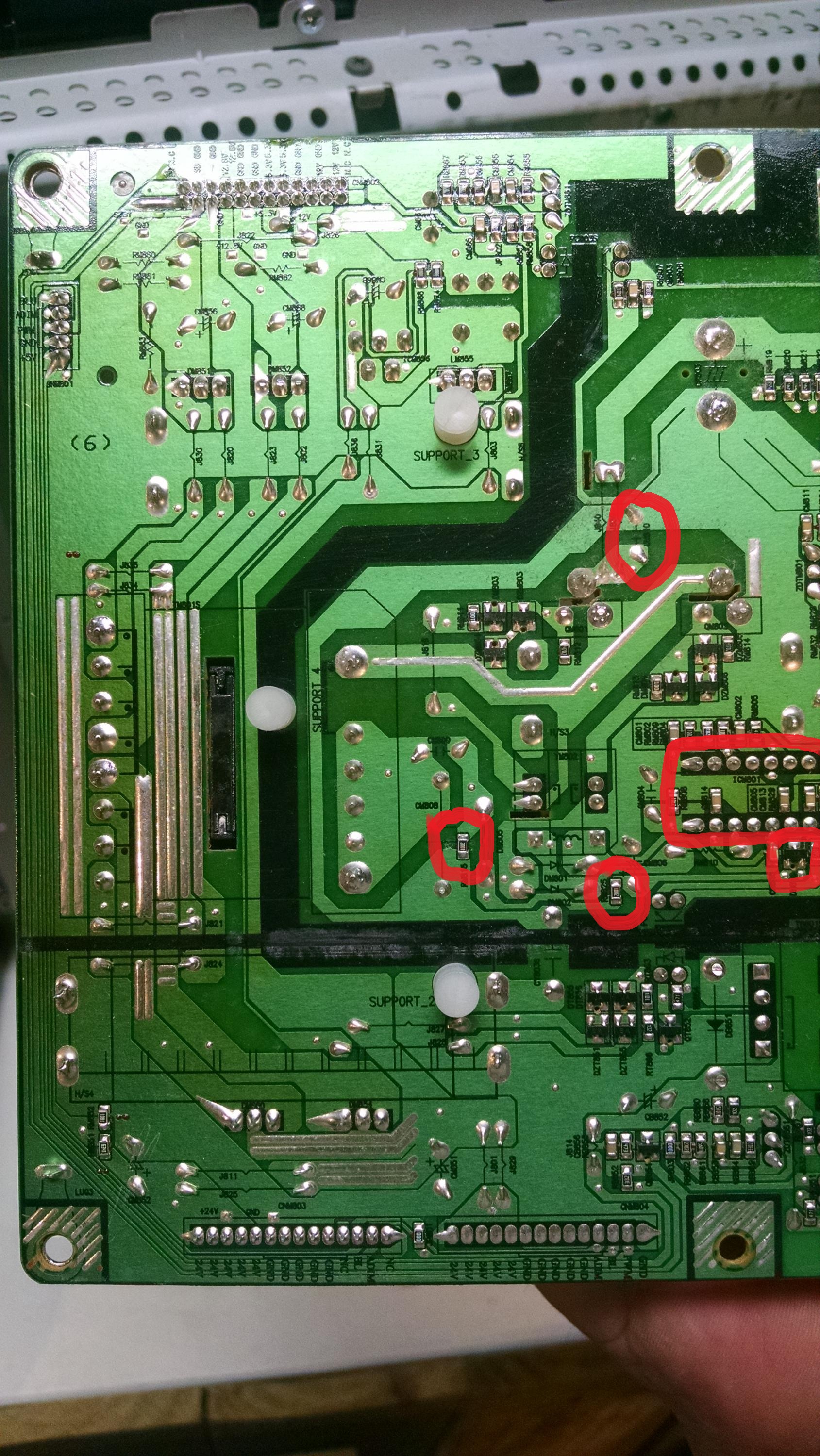 I've disconnected the Main Board from the PSU and when connecting to mains the backlight turns on which suggests the PSU might be ok. I've measured the voltages out of the PSU and they seem reasonable (like the labels say). The main board has no obvious burns, there are no shorts on the power rails anywhere....