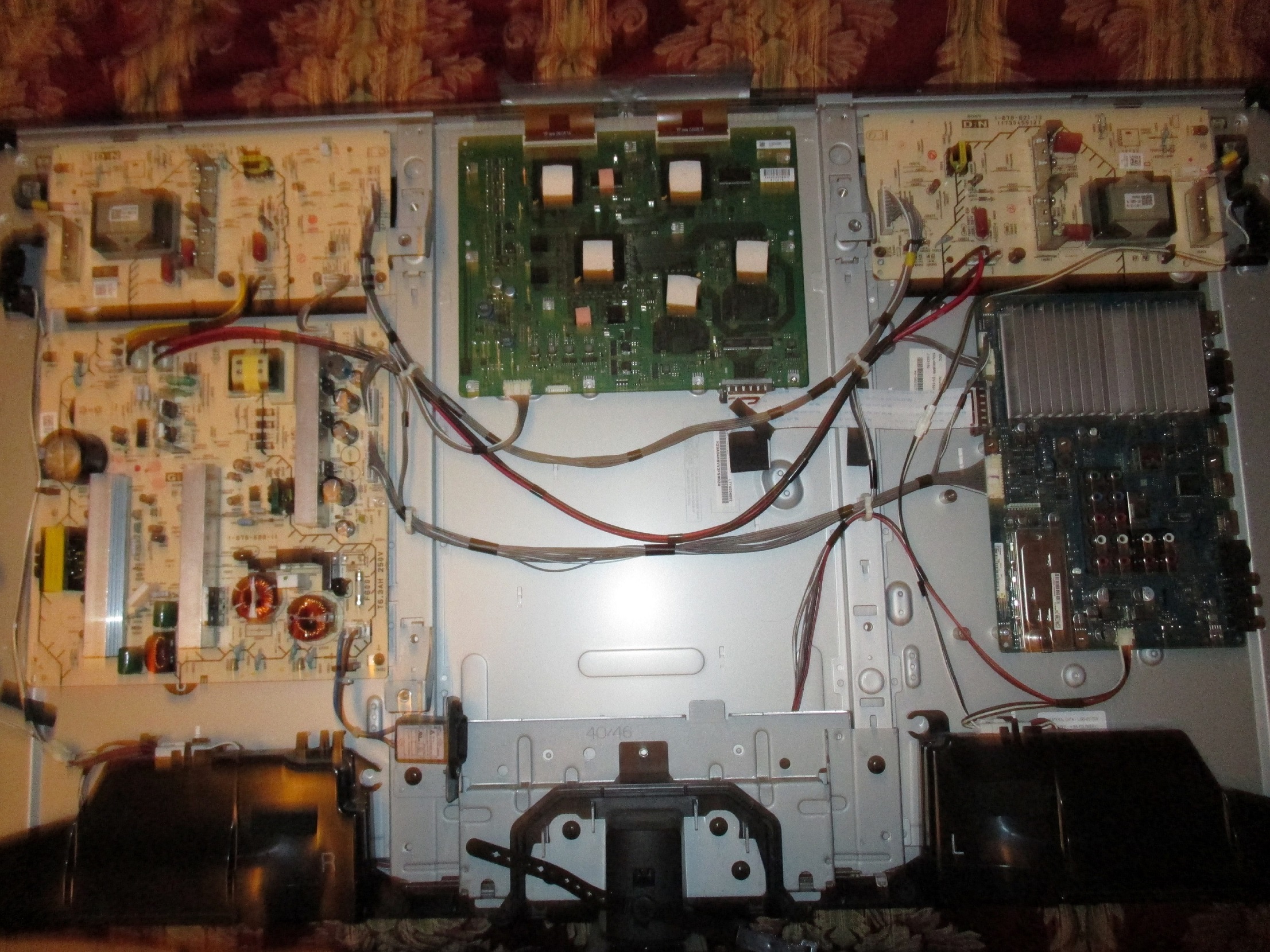 I picked up this TV from CL. The TV had been opened, and I was told the Sony Techs diagnosed it as needing a main board which they couldn't find. I got it home, when I first powered it on, the words BRAVIA flashes for a second and the backlights stay on for 20 seconds, but no video or OSD. The backlights then turned off. All this time, the green LED in the front stays lit. If you hit the power button again it turned off, and iif you hit again, then it turns on, except, this time there is no "BRAVIA". Just a blank screen with backlight behind it. I got rid of the old main board and bought a new main board (yes I know it really is the main board, part number A-1728-743-A). With this board in place, now all the same behaviour repeats, except, now there is no BRAVIA that flashes either. Just a lit screen initially, followed by the BL turning off followed by nothing. If u try to turn on again, no BL this time, and green LED stays lit. The voltages from the PSU are all correct, 12Vunreg, 12V reg and 15V. I measured the voltages on some of the connectors, and in particular noticed that when the BL shuts down and the TV goes into a "coma" the inverter_err pin gets set to 1.9V (normal=0). At this point I do not know what the hell is wrong with this TV. If anyone has any experience with this set please help out. I have attached a picture of the boards.