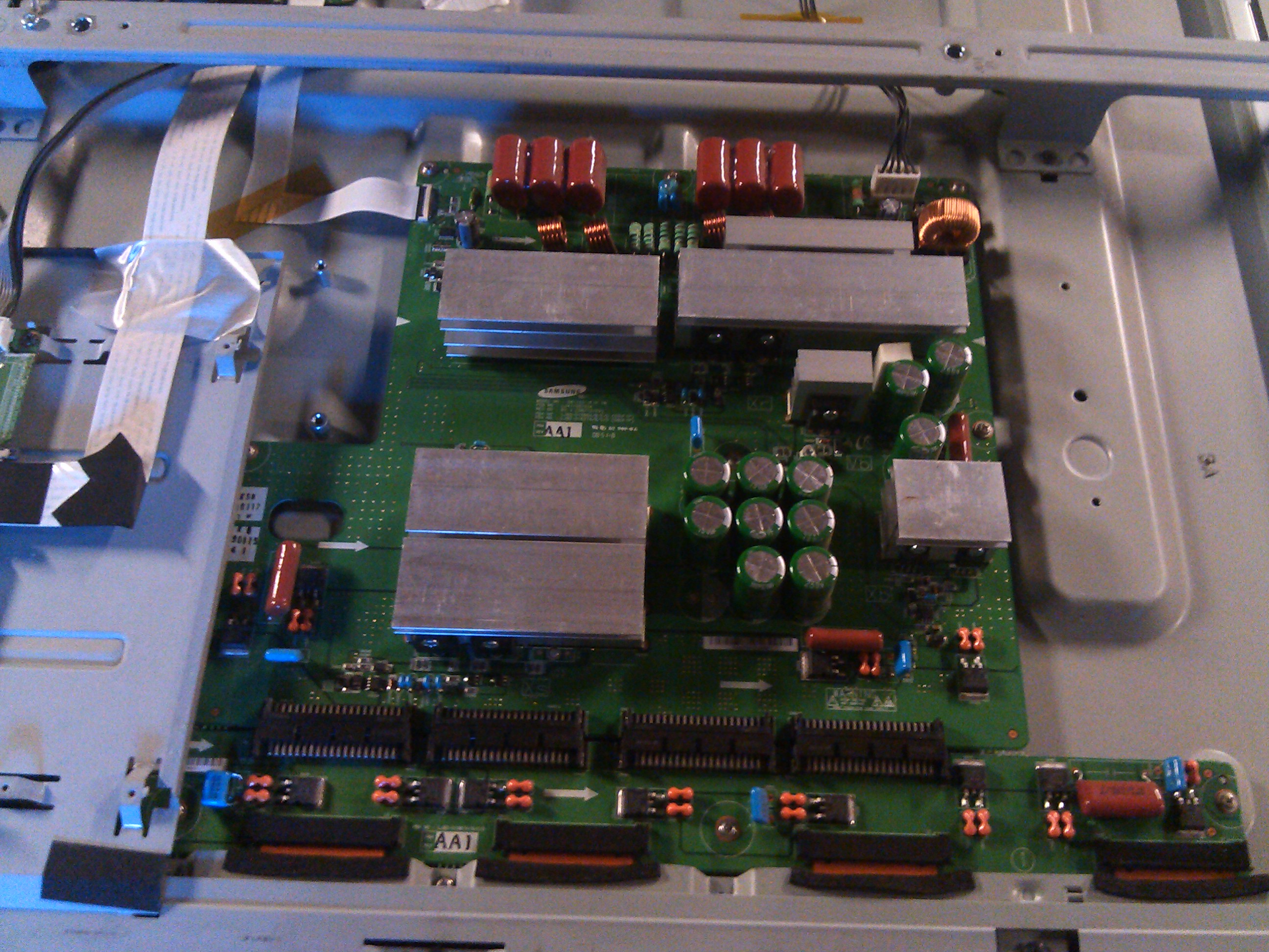 It had a TON of cracked solder joints on these boards, fixed all that I could find, but in the last test I forgot to plug in the Y-SUS to control board flat cable, it was left dangling and possibly some pins shorted to the panel metal ground, the X-Main buzzed quietly then blew up in 3 seconds after powering up, annoying.