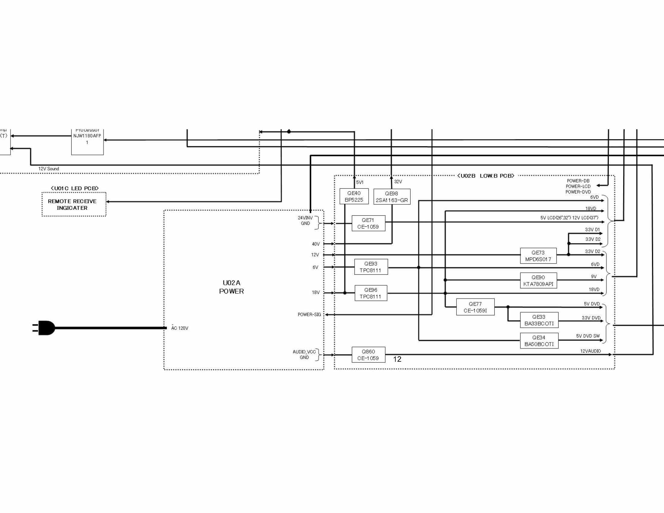 OK, per SCH you provided, there is an always on power supply (see SCH U02 POWER (3) SUB_POWER page) that has four output voltages: 40V, 18V, 12V, and 6V. All of them has fuse for the protection. So do you have those voltages on the output connector of the power supply?