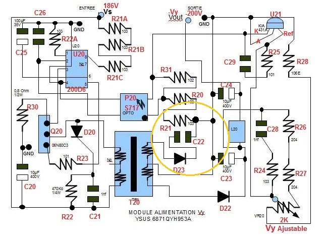 The 400V caps seem fine. I found this diagram that appears to have the C22 cap circled that I mentioned earlier. Of course, the cap's values aren't listed. I measured the cap in the same location on the PS102 board with it still installed, and it measures 0.22uF and 24.5 ohms ESR. From what I can tell, the PS101 cap is physically smaller - I got 0.11uF when I measured it.