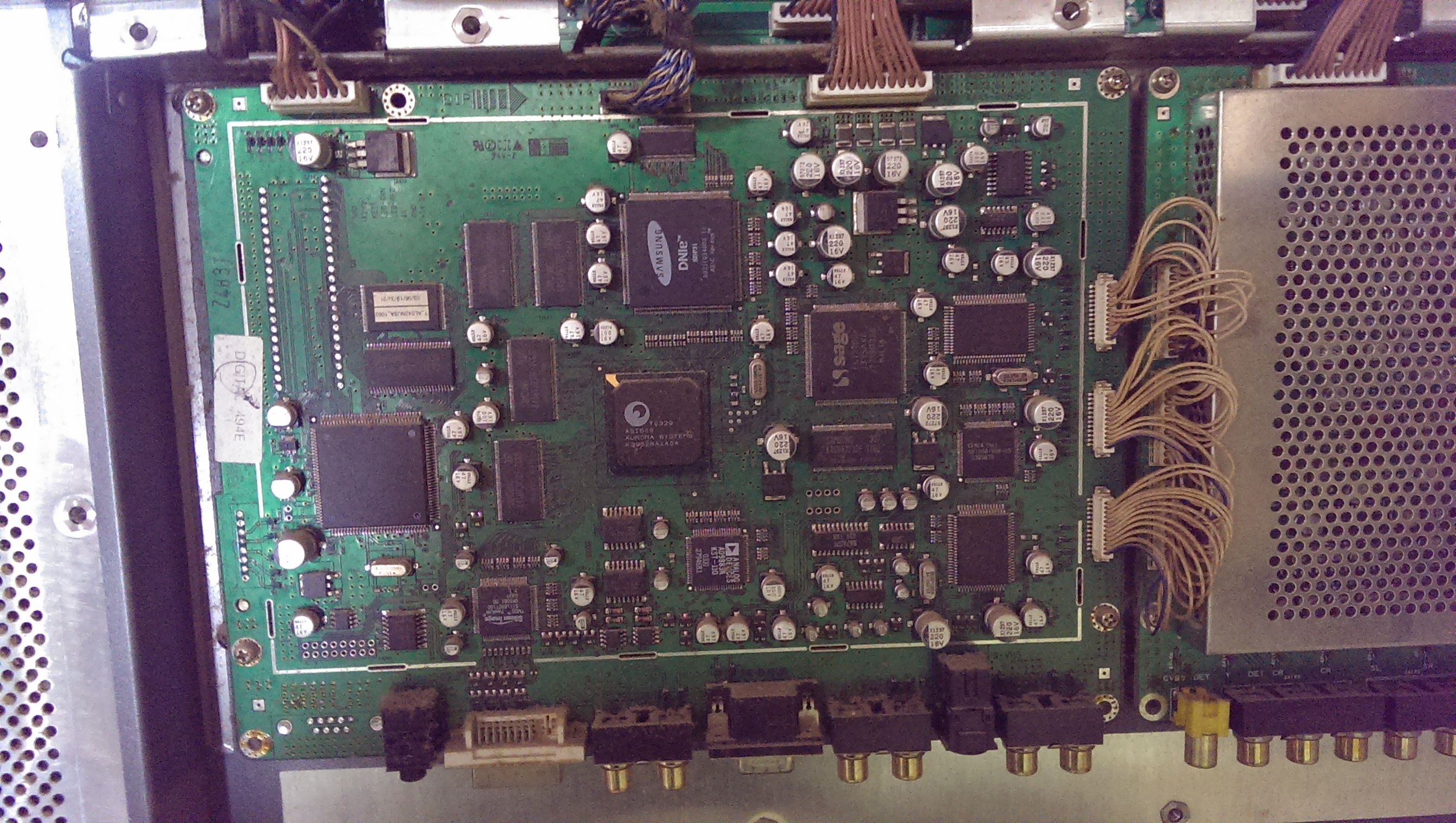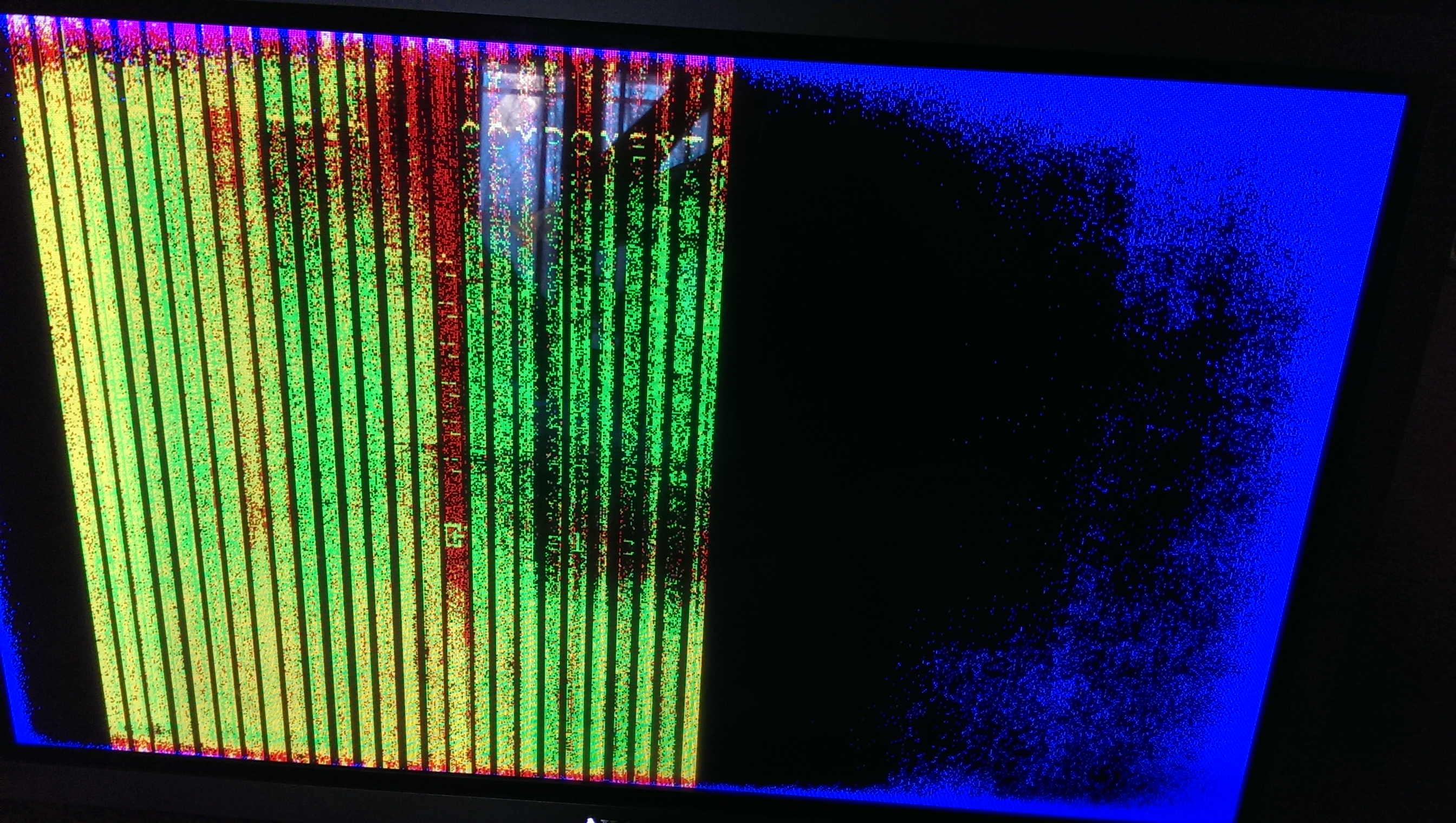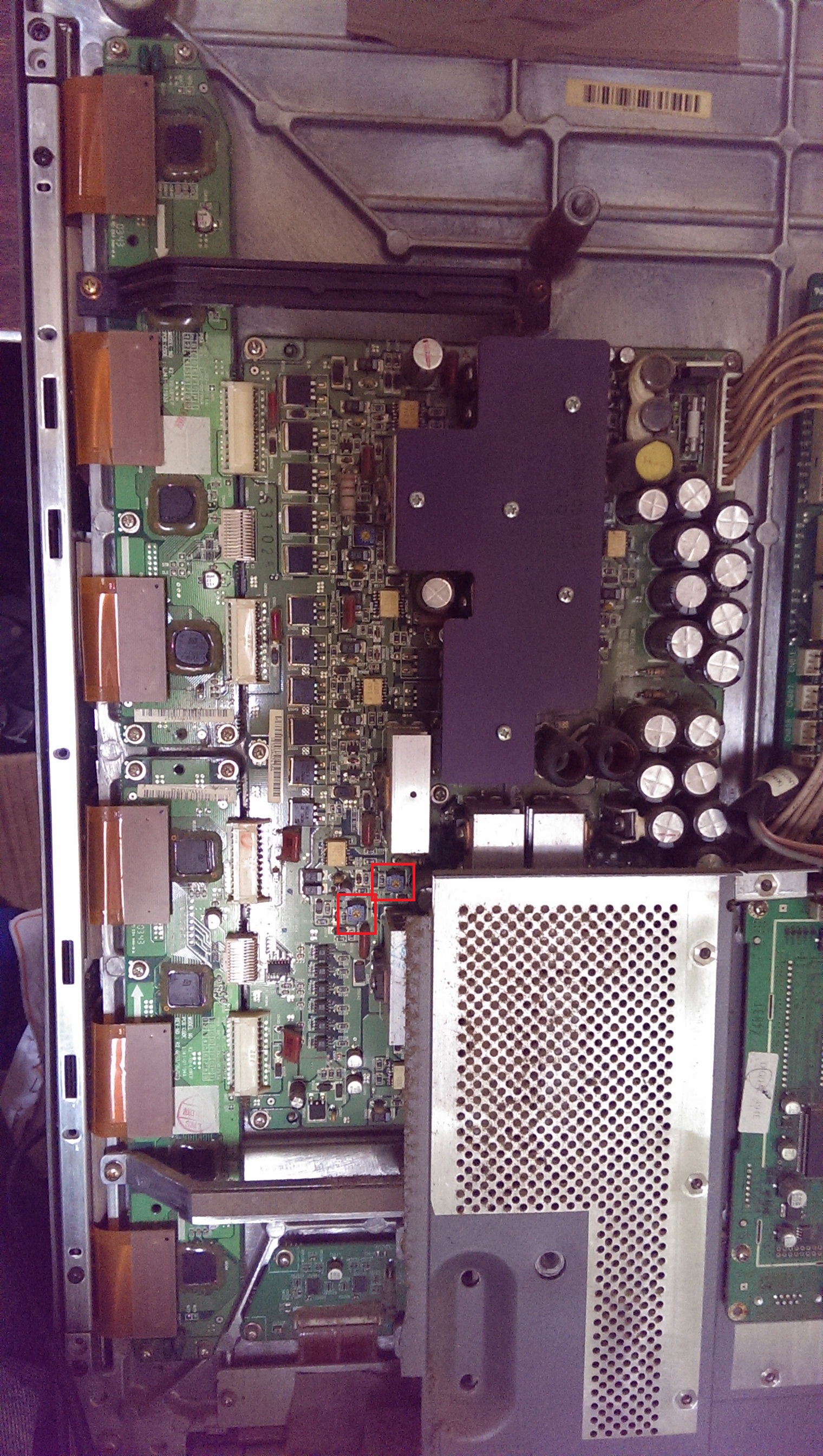 The power supply was a suspicion of mine from the start, as I have worked on several LCD monitors and a couple LCD TV's. Got it home and it wouldn't turn on, the light just flashed, and it had some mega bulged caps. (The board was actually melted under one of the caps, See Pictures). I replaced those, went to turn it on, and it fired right up, but it had some pretty weird stuff going on with the image. (Again, see pics)