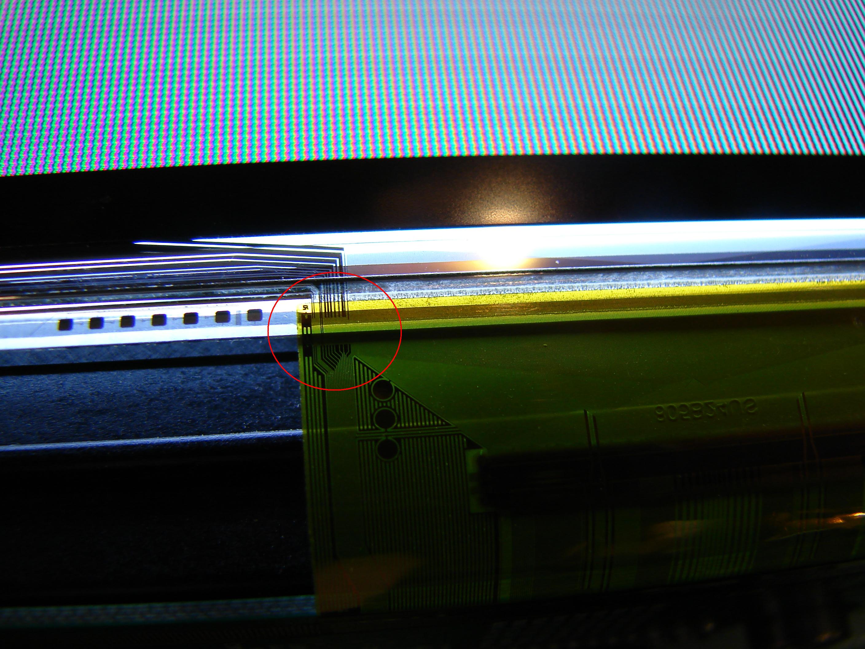 I suspected, tab bond, and it most likley is, except its NOT an issue with the tab bond to the PC board, it looks like an issue with the bond to the panel itself. I was able to lift the lcd panel up slightly and the picture was perfect, I then pressed lightly in the area circled and the picture would give lines etc. and sometimes would go out completely. When it went out completely the set would need to be turned off and back on to get the picture back.
