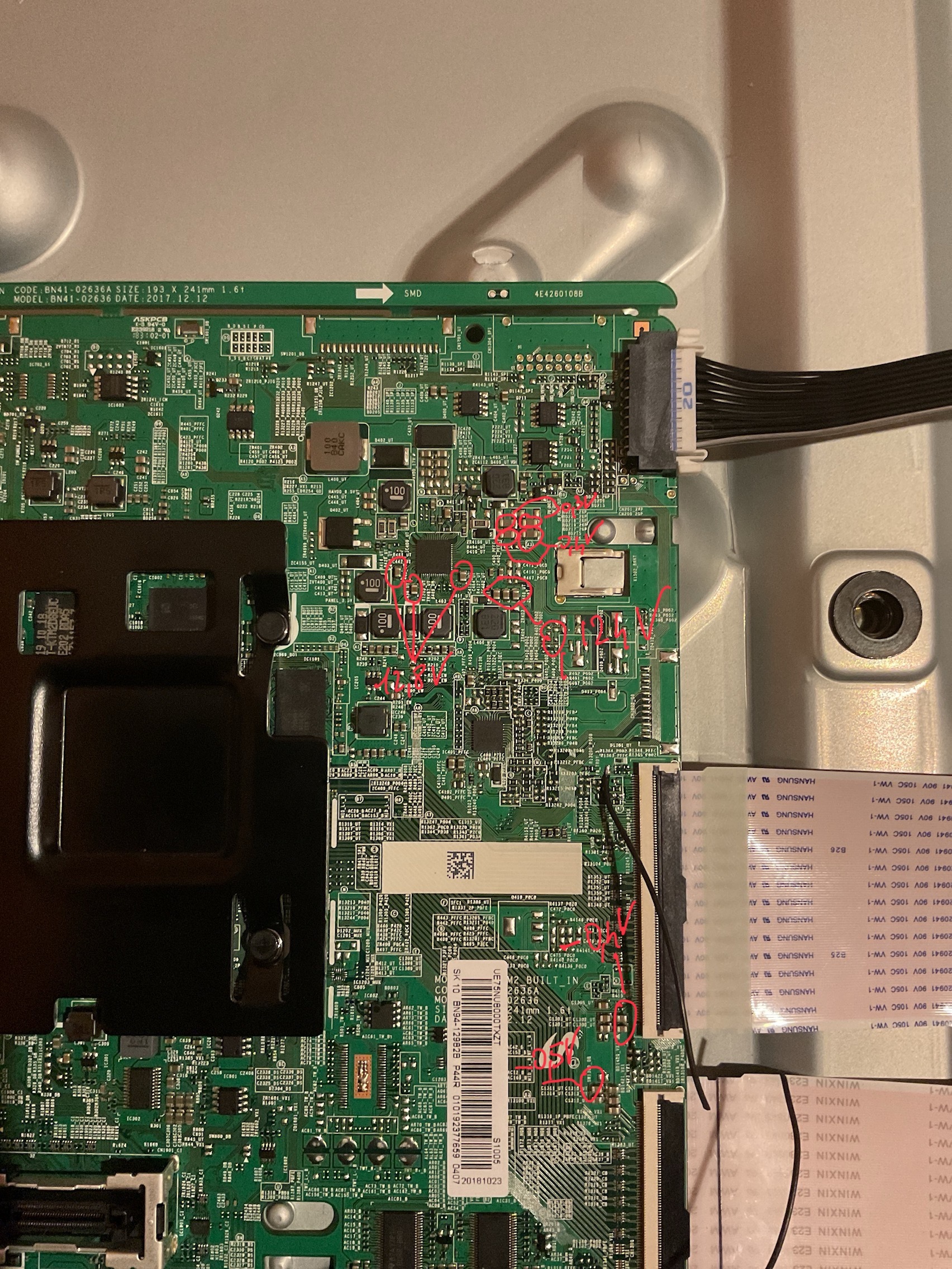 No need to spend money on MB replacement... he did the test DC to DC was in range however the SoC GPU in 100% tact., just he solder the points and unplug first the lower LVDS and then put it back and unplug the other one.... unplug and plug should be when the TV out from wall socket ,, good luckComment