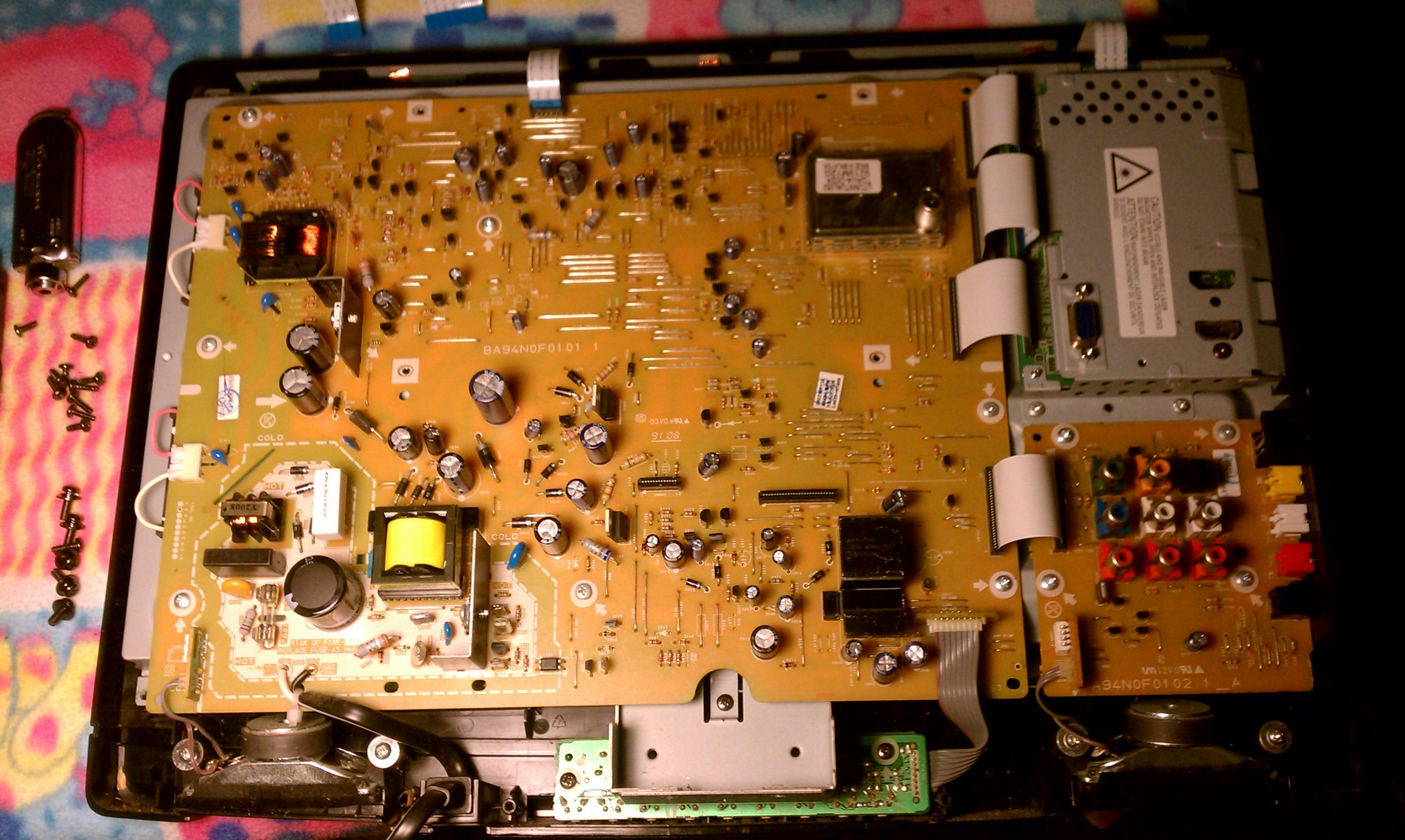 i took it apart and unplugged the DVD drive from the mainboard. now when i plug it in, it turns on by itself and then goes through 3 screens (digital television, RED, GREEN) then goes into standby mode. the DVD light is lit up.