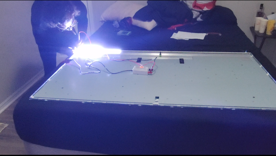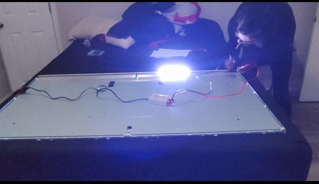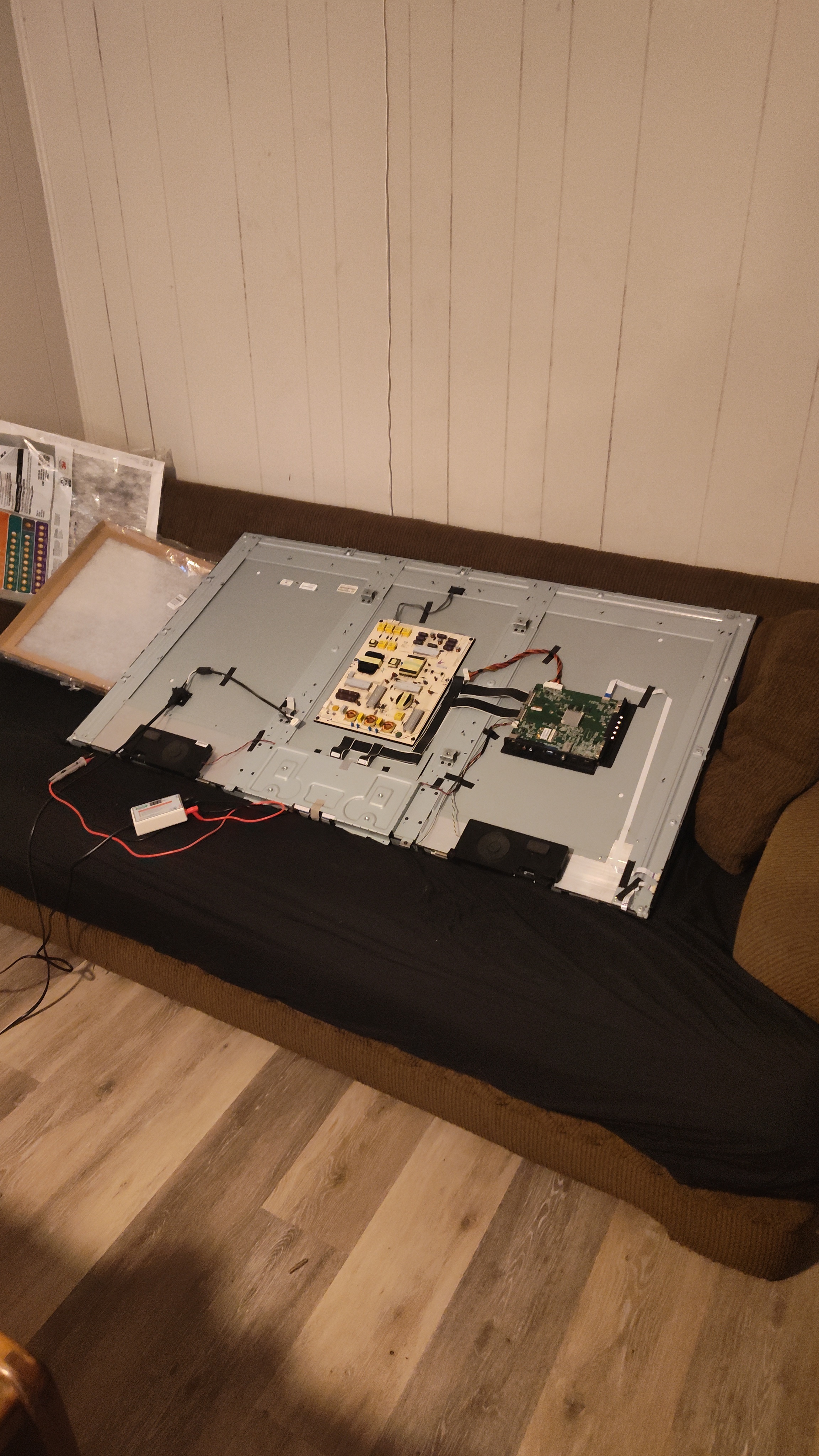 I didn't realize this was an edge lit tv. Because of this you're going to need to be extra diligent when putting the thick plastic diffuser back in place. It has to sit PERFECTLY in order to evenly distribute the light, otherwise you'll have very bright areas and dark areas. Make sure light is spread evenly before placing the panel back in, and also after. You don't need the panel connected, just in place. Plug the main board into the power supply and plug the power cord in. If it doesn't turn on by itself, press the power button and it should turn on even with the panel disconnected.