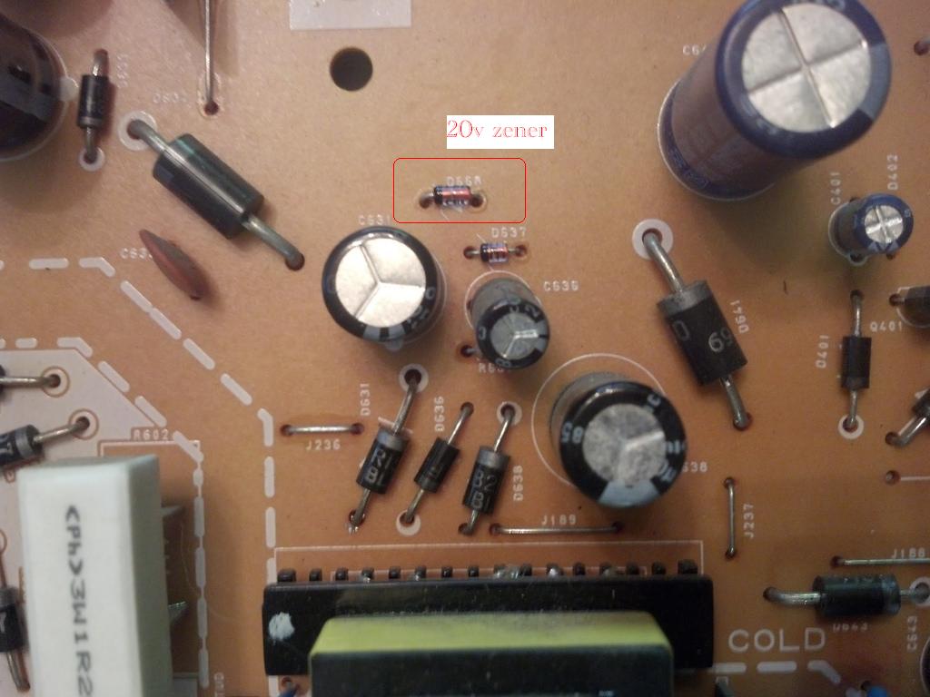 Wife dragged me to the dump tonight, and I spied this little bugger in the electronics bin and snagged it. As it was a funai I thought it would have the common blown components in the power supply. When plugged in there was no standby light, upon opening it I was shocked to find the mosfet, fuse and 2.2 ohm resistor intact. A quick check with the multi meter zeroed me in on a shorted 20B zener in the secondary (D668). After replacing it the set now works as well as a funai set ever will.