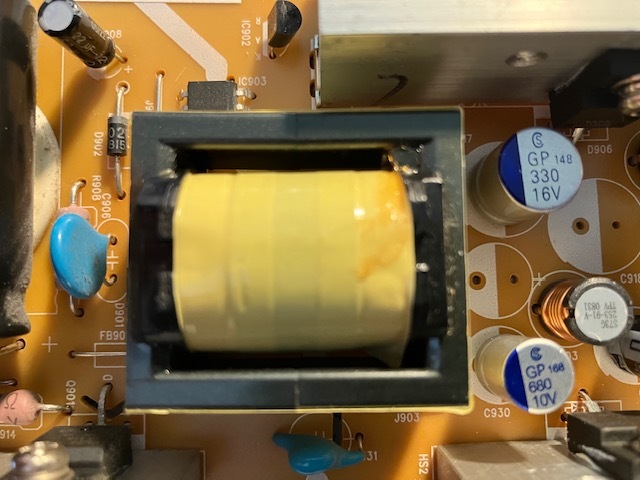 First, the television kept rapidly power cycling. I've warmed up the capacitors with a hairdryer, and after 3 dimmed red blinks, the backlight turned on, then turned dim, and no picture was present on the screen.
