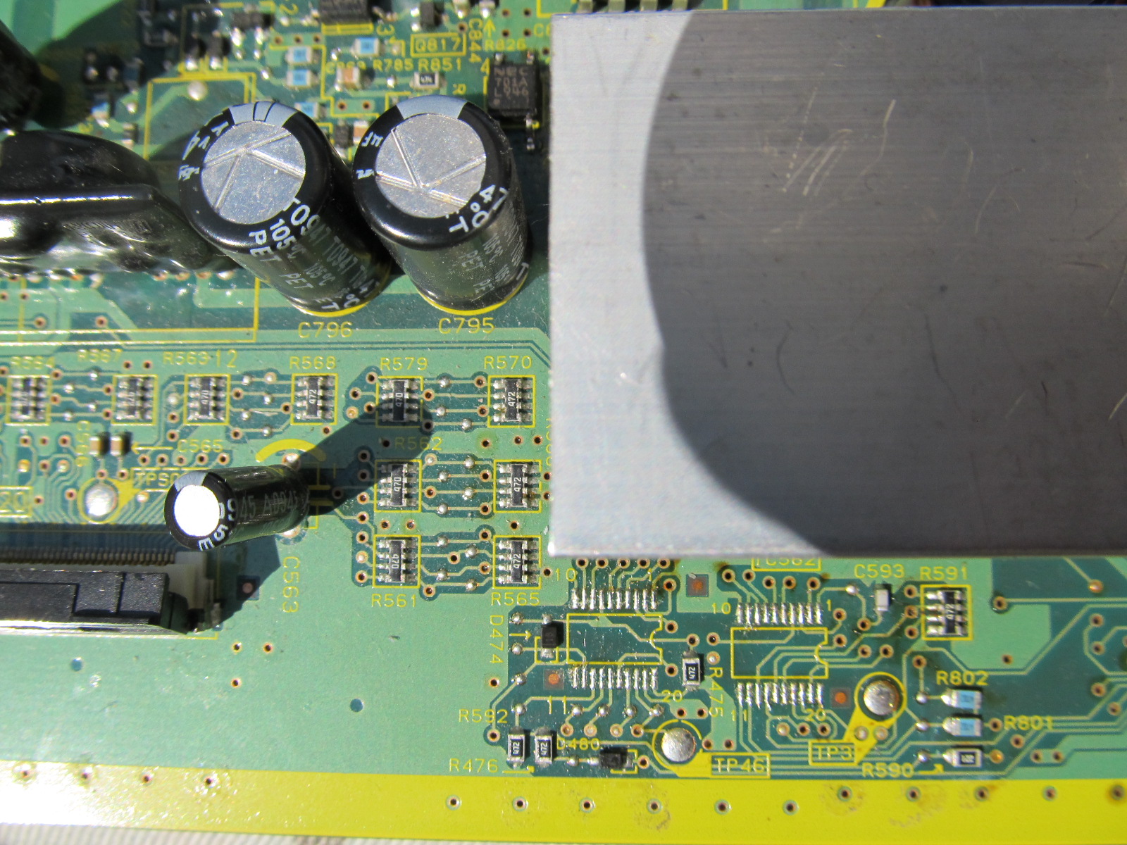 I already tried once to repair it by changing shorted bits, but it gone short again right after power up. SC50 was jumpered, so none of buffer boards could kill it. Things i've replaced first time were: Q660,661,621,622,421,422,423,441,403. Also q551,702, ic773,464,465,d865. Obviously missed something first time.
