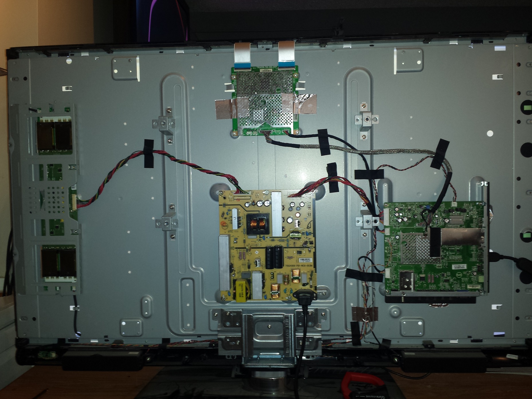 This is the TV This TV is a little different from the Samsung I have worked on. Power supply is on the Left side, Main Bd is on the right side, T-CON , not in the picture is on the bottom. I am assuming that the boards in the middle are the LED...