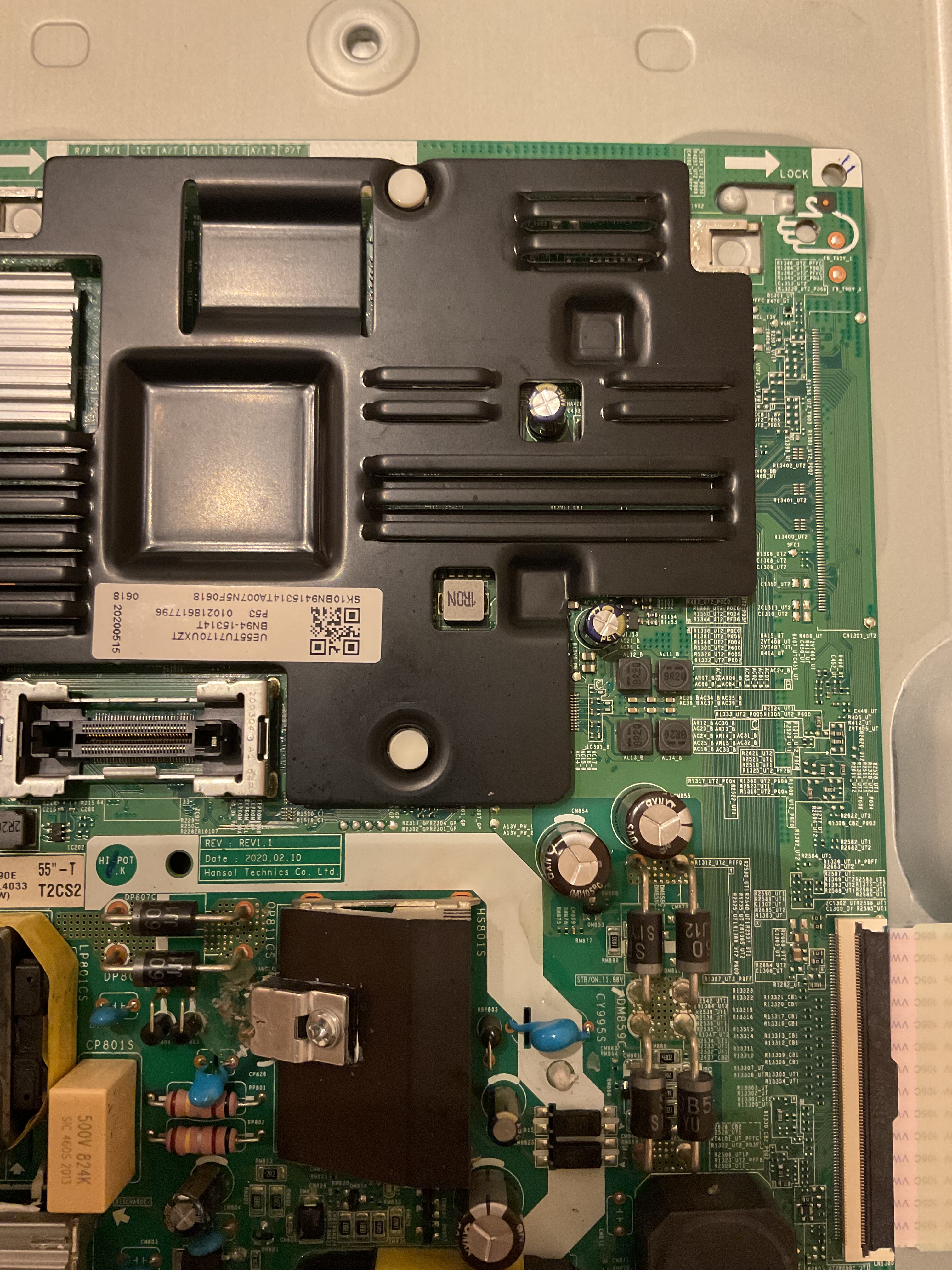 the model of tv is ue55tu7170u, i put one photo of the main board. When i plug in the cord of tv, the standby led turn on for a second then all is black, no back light no standby led nothing. If I press the buttons on the remote I see the standby led flashes but nothing happen. I put some voltage I have, the standby voltage on the main board should be 11,8 volts but I have 13,1 volts not sure it s ok. And in some coil I have the 3,e volt stable, the 5 volt stable, on some diode I have 0,8 to 1,3 volts that is not stable always change. And the back light start with 250 volts but goes down…someone can help me it s a board problem or I need to flash the eprom I really need your help thanksComment