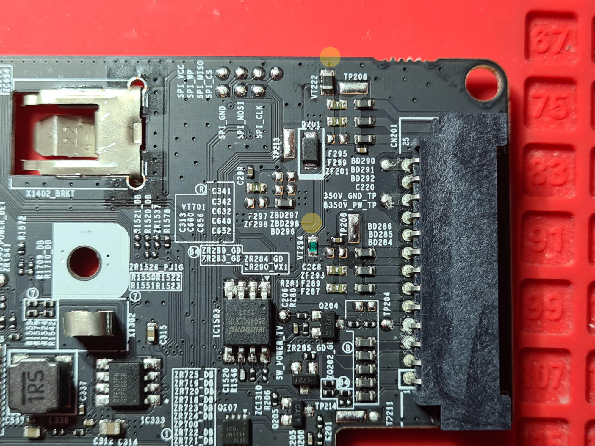 The power supply board gets the power on voltage of 3.3V and the 350V but no 13V(12.8V). I found a component on the main board without a value( OL on the multimeter) and I don't know what it is. It is marked as VT and is green. Could it be a smd thermistor? Picture attached for the main board and the component.