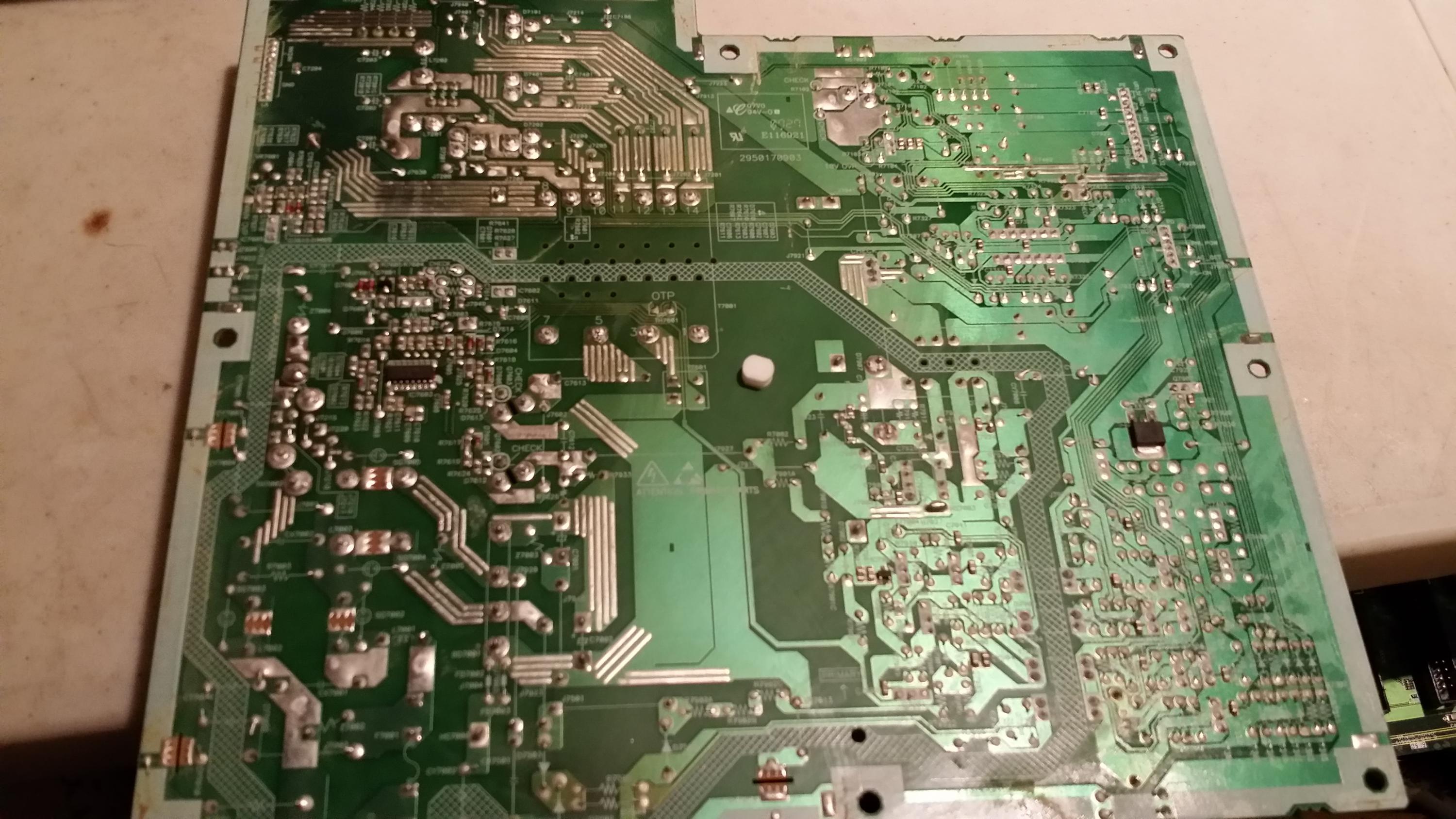 Post good clear pictures of the back side pf the TV and whole picture of this power supply board. There should be big main filter cap in the primary side of the circuit, it should have about 165~170VDC right at the two legs of the cap.