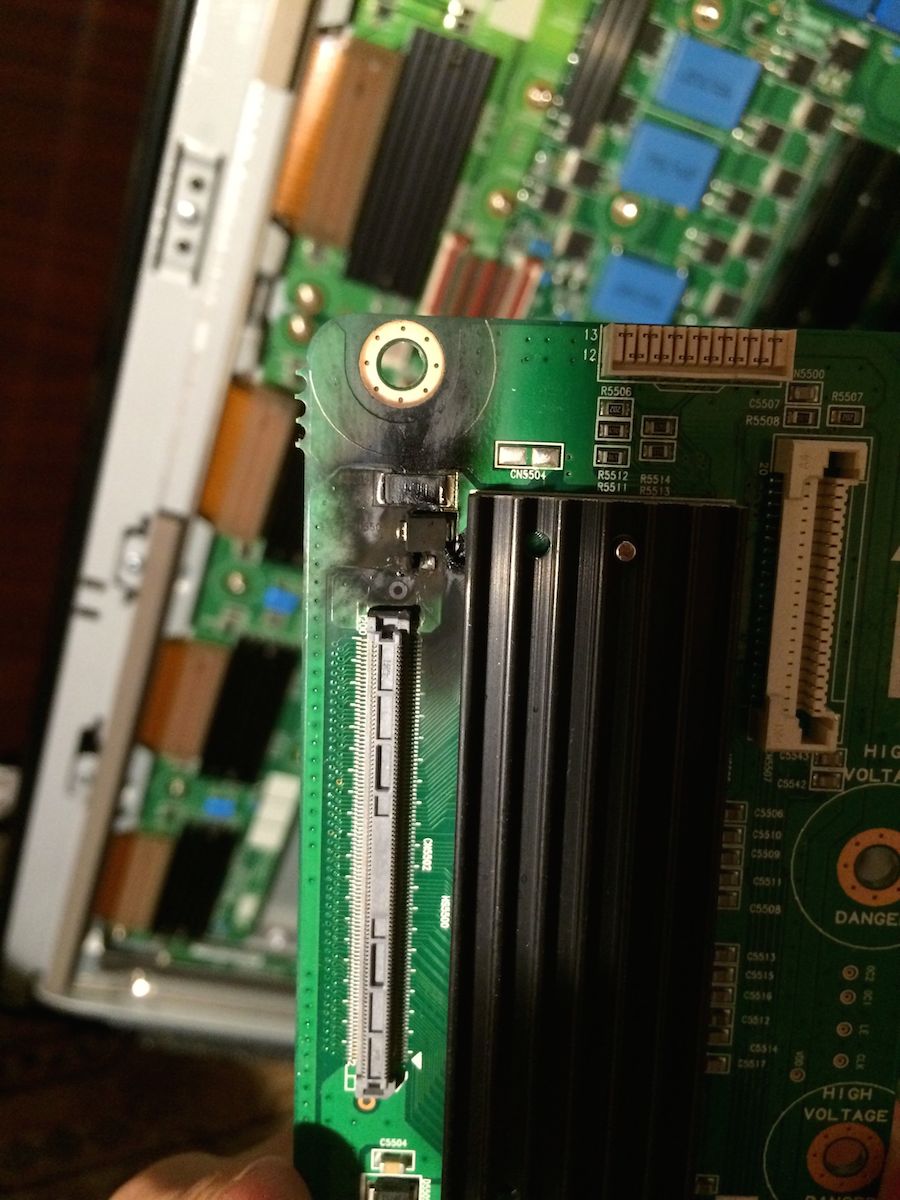 I've attached pics of the original lower buffer before/after burning up. You can see a small crack in the capacitor C5503 that was arcing on power up. The picture of the lower screen was taken prior to the capacitor burning up. I can only get the upper half to come on now.