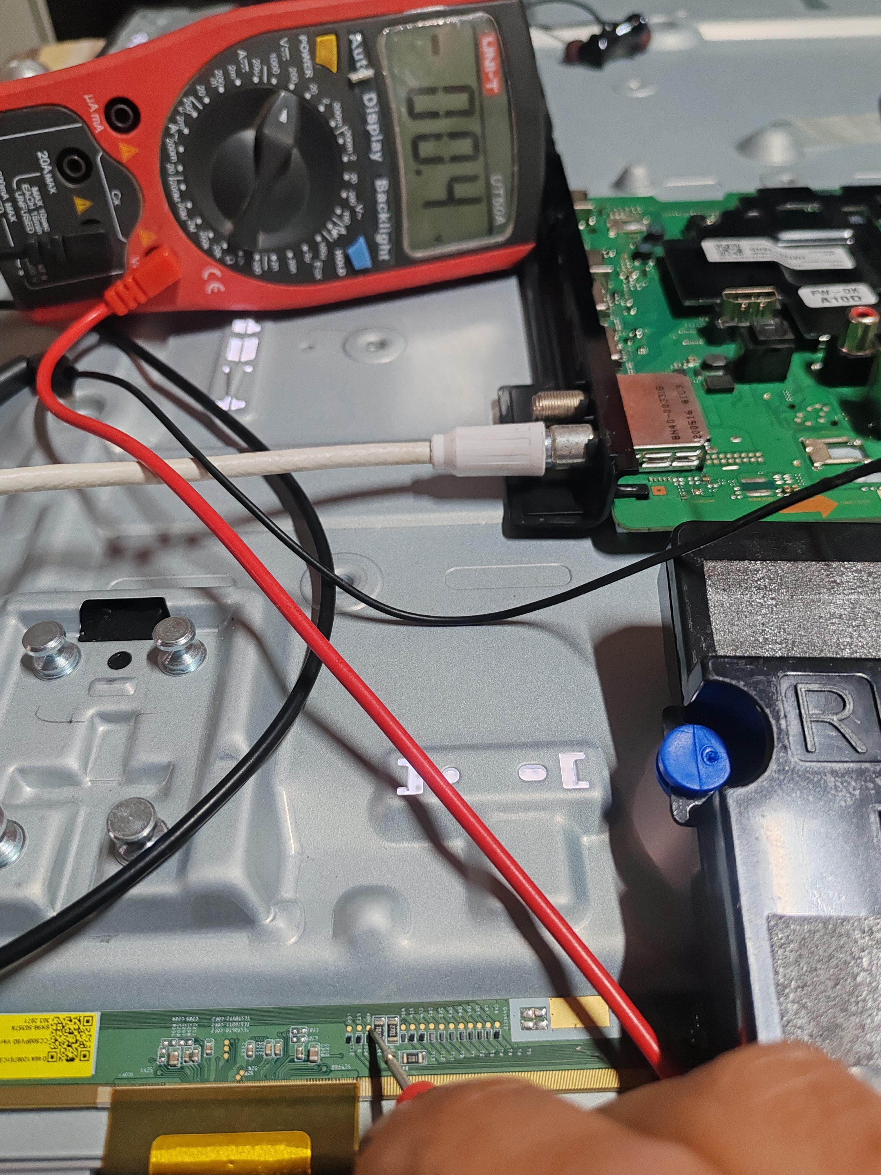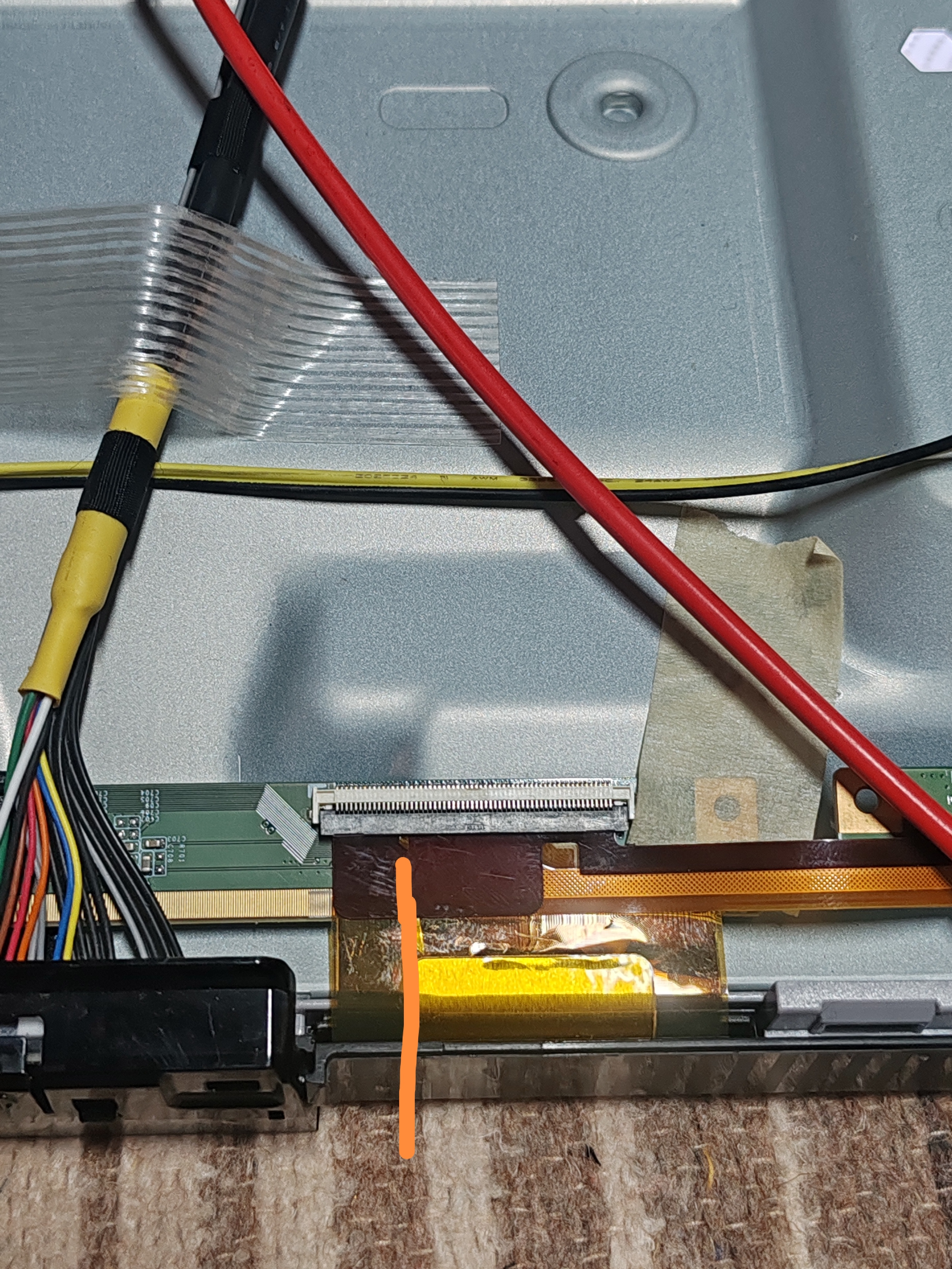 by thesameThe tv is restarting every 5 seconds with no image , i have tryed to remove each of the flex cables separatelly , then the tv stays on , i can hear the sound starting, but no video, i have found a some pins to cover with tape and i get video but after a few seconds a few vertical lines fade in the image, has anyone any idea what should i check or do next?